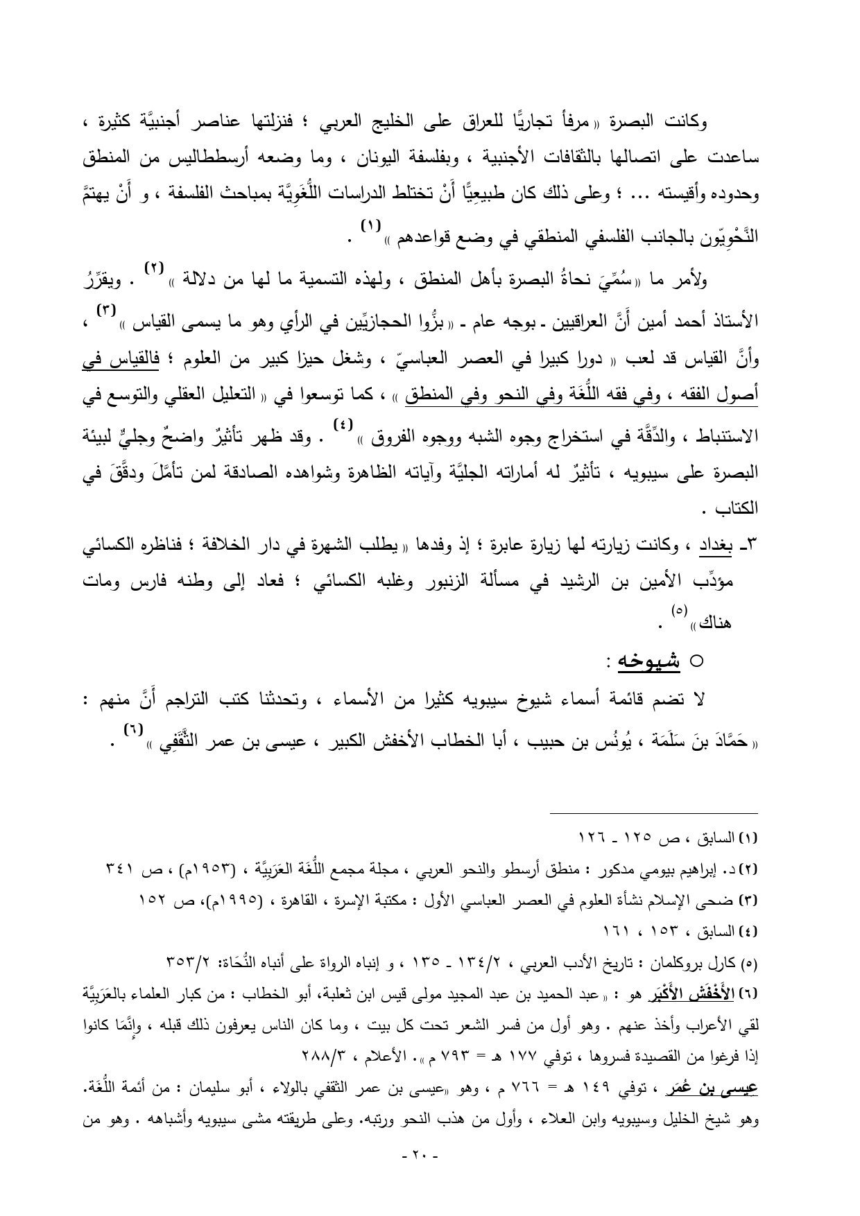 ولأمر ما «سُمِّيَ نحاةُ البصرة بأهل المنطق، ولهذه التسمية ما لها من دلالة») (¬2). ويقرِّرُ الأستاذ أحمد أمين أَنَّ العراقيين ــ بوجه عام ـــ «بزُّوا الحجازيِّين في الرأي وهو ما يسمى القياس») (¬3)، وأنَّ القياس قد لعب «دورا كبيرا في العصر العباسيّ، وشغل حيزا كبير من العلوم؛ فالقياس في أصول الفقه، وفي فقه اللُّغَة وفي النحو وفي المنطق»، كما توسعوا في «التعليل العقلي والتوسع في الاستنباط، والدِّقَّة في استخراج وجوه الشبه ووجوه الفروق») (¬4). وقد ظهر تأثيرٌ واضحٌ وجليٌّ لبيئة البصرة على سيبويه، تأثيرٌ له أماراته الجليَّة وآياته الظاهرة وشواهده الصادقة لمن تأمَّلَ ودقَّقَ في الكتاب.