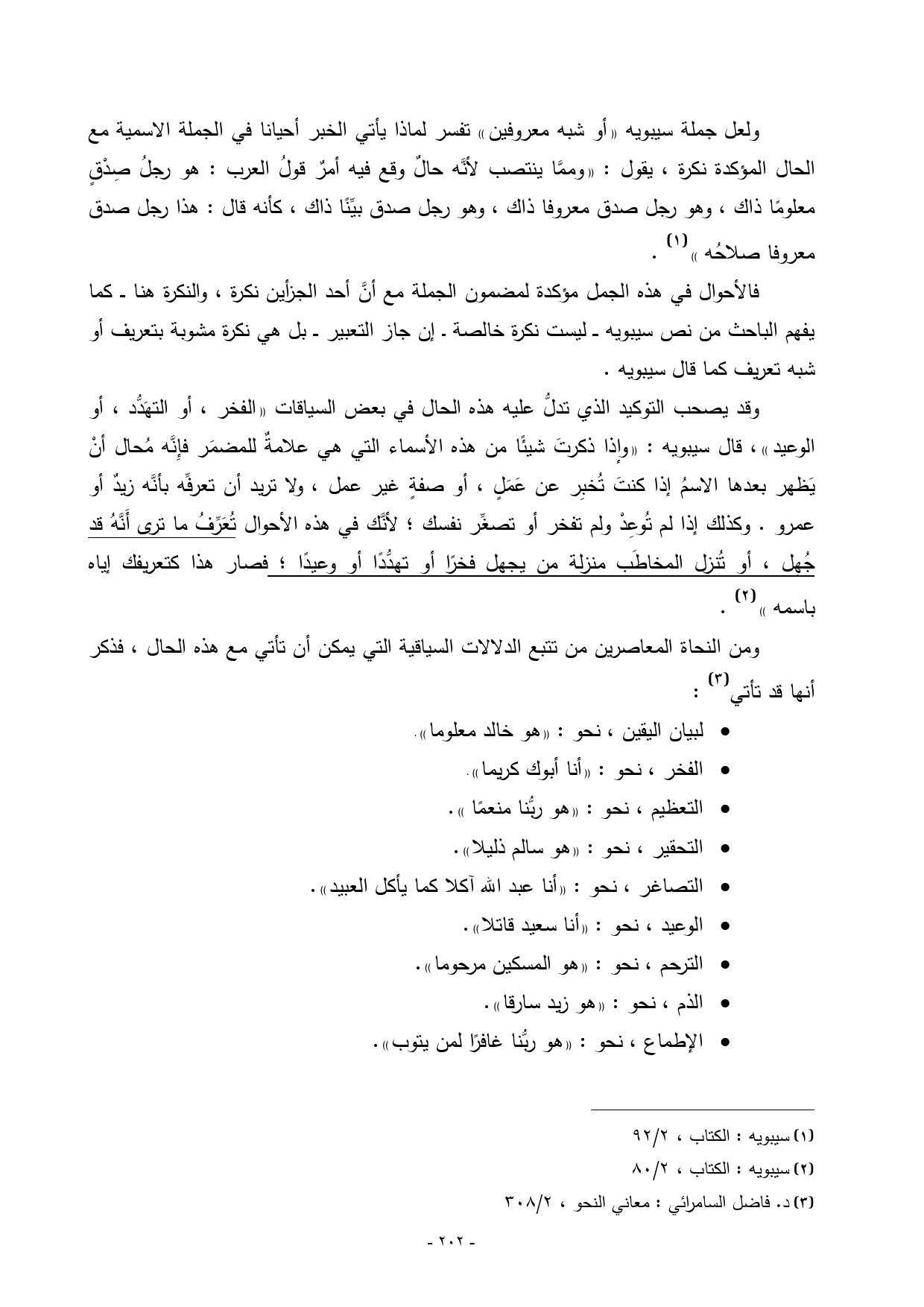 فالأحوال في هذه الجمل مؤكدة لمضمون الجملة مع أنَّ أحد الجزأين نكرة، والنكرة هنا ـــ كما يفهم الباحث من نص سيبويه ـــ ليست نكرة خالصة ــ إن جاز التعبير ـــ بل هي نكرة مشوبة بتعريف أو شبه تعريف كما قال سيبويه.