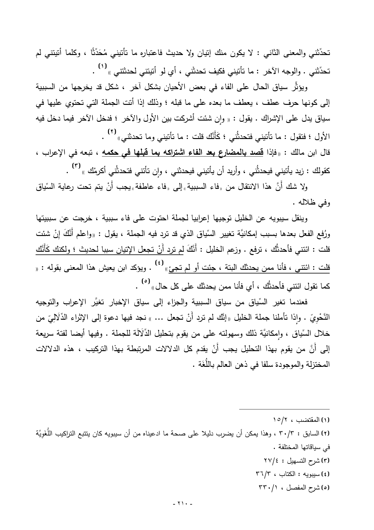 قلت: ائتني فأحدثُك، ترفع. وزعم الخليل: أَنَّكَ لم ترد أَنْ تجعل الإتيان سببا لحديث؛ ولكنك كَأَنَّك قلت: ائتني، فأنا ممن يحدثك البتة، جئت أو لم تجئ») (¬4). ويؤكد ابن يعيش هذا المعنى بقوله: «كما تقول ائتني فأحدثُك، أي فأنا ممن يحدثك على كل حال») (¬5).