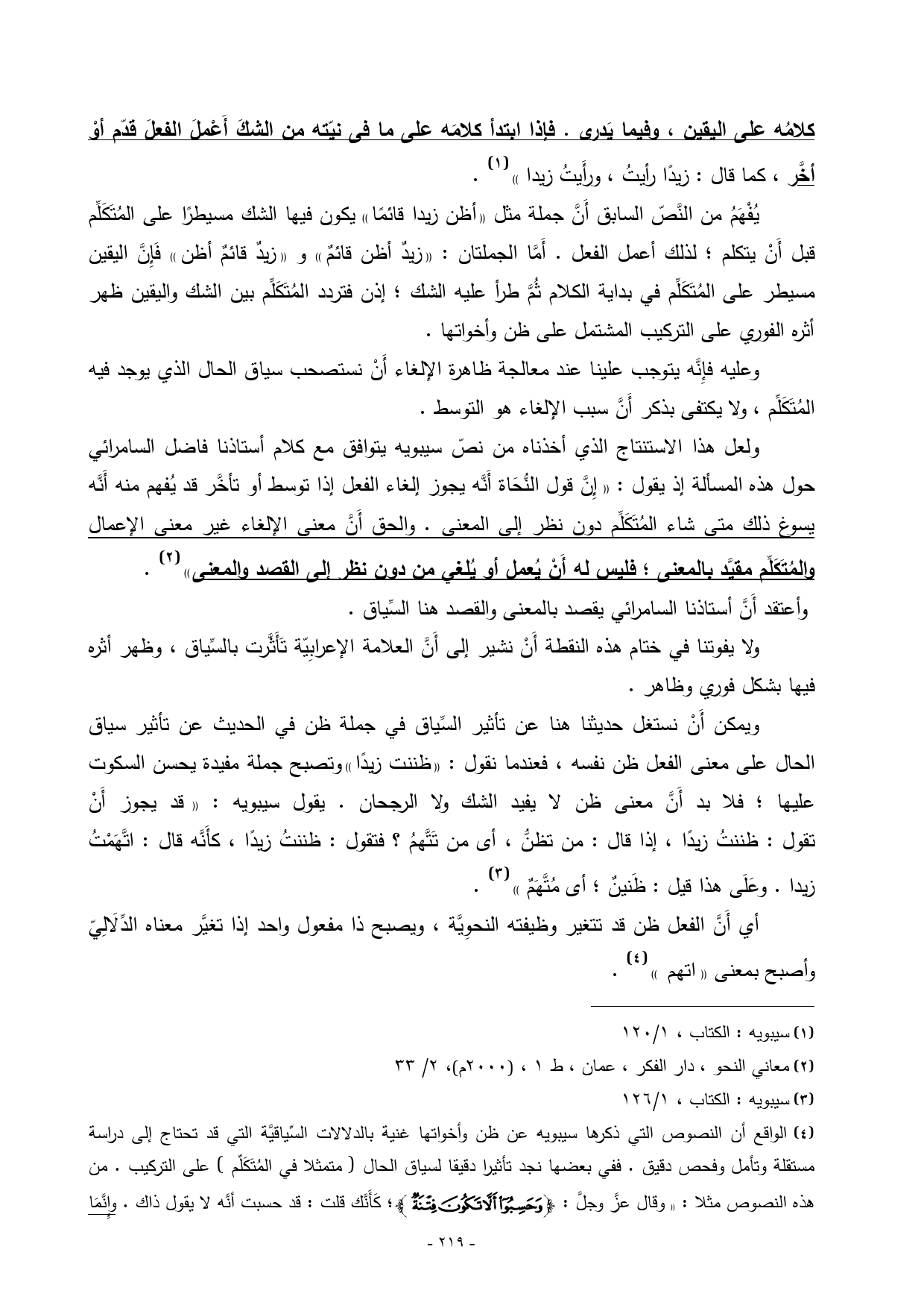 ولعل هذا الاستنتاج الذي أخذناه من نصّ سيبويه يتوافق مع كلام أستاذنا فاضل السامرائي حول هذه المسألة إذ يقول: «إِنَّ قول النُّحَاة أَنَّه يجوز إلغاء الفعل إذا توسط أو تأخَّر قد يُفهم منه أَنَّه يسوغ ذلك متى شاء المُتَكَلِّم دون نظر إلى المعنى. والحق أَنَّ معنى الإلغاء غير معنى الإعمال والمُتَكَلِّم مقيَّد بالمعنى؛ فليس له أَنْ يُعمل أو يُلغي من دون نظر إلى القصد والمعنى») (¬2).