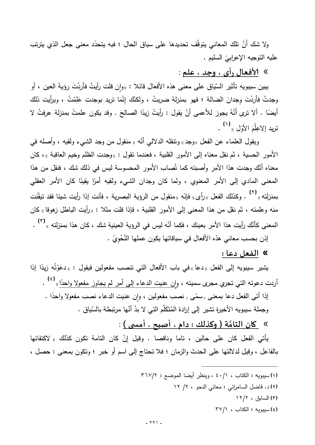 يبين سيبويه تأثير السِّياق على معنى هذه الأفعال قائلا: «وإن قلت رأيتُ فأردْتَ رؤيةَ العين، أو وجدتُ فأردْتَ وِجدانَ الضالة؛ فهو بمنزلة ضربتُ، ولكنّك إِنَّمَا تريد بوجدت عَلِمْتُ، وبرأيت ذلك أيضًا. ألا ترى أَنَّهُ يجوز للأَعمى أنْ يقول: رأيتُ زيدًا الصالحَ. وقد يكون علمتُ بمنزلة عرفتُ لا تريد إلاعِلْمَ الأوّل») (¬1).