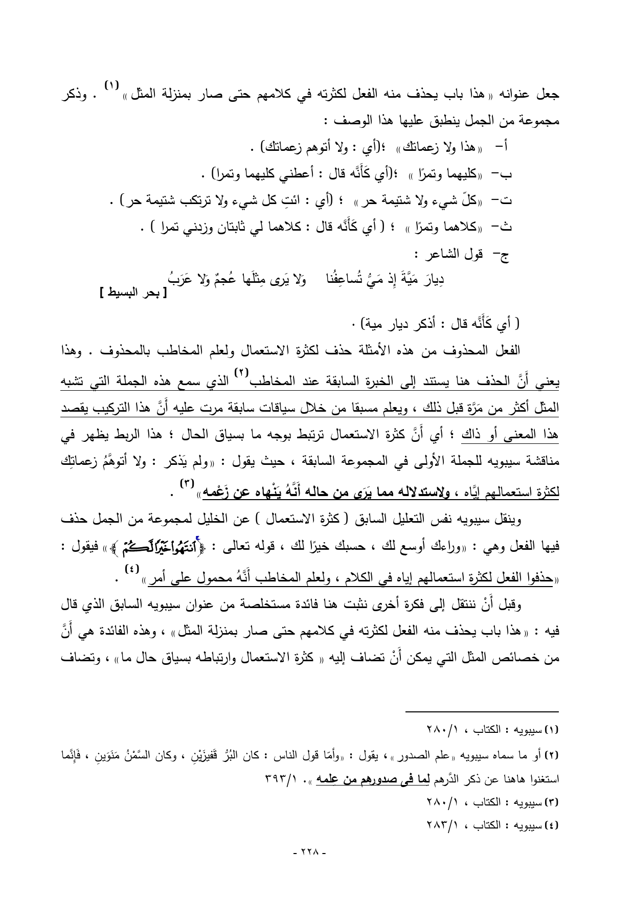 الفعل المحذوف من هذه الأمثلة حذف لكثرة الاستعمال ولعلم المخاطب بالمحذوف. وهذا يعني أَنَّ الحذف هنا يستند إلى الخبرة السابقة عند المخاطب) (¬2) الذي سمع هذه الجملة التي تشبه المثل أكثر من مَرَّة قبل ذلك، ويعلم مسبقا من خلال سياقات سابقة مرت عليه أَنَّ هذا التركيب يقصد هذا المعنى أو ذاك؛ أي أَنَّ كثرة الاستعمال ترتبط بوجه ما بسياق الحال؛ هذا الربط يظهر في مناقشة سيبويه للجملة الأولى في المجموعة السابقة، حيث يقول: «ولم يَذكر: ولا أتوهَّمُ زعماتِك لكثرة استعمالهم إيَّاه، ولاستدلاله مما يَرَى من حاله أَنَّهُ يَنْهاه عن زَعْمه») (¬3).
