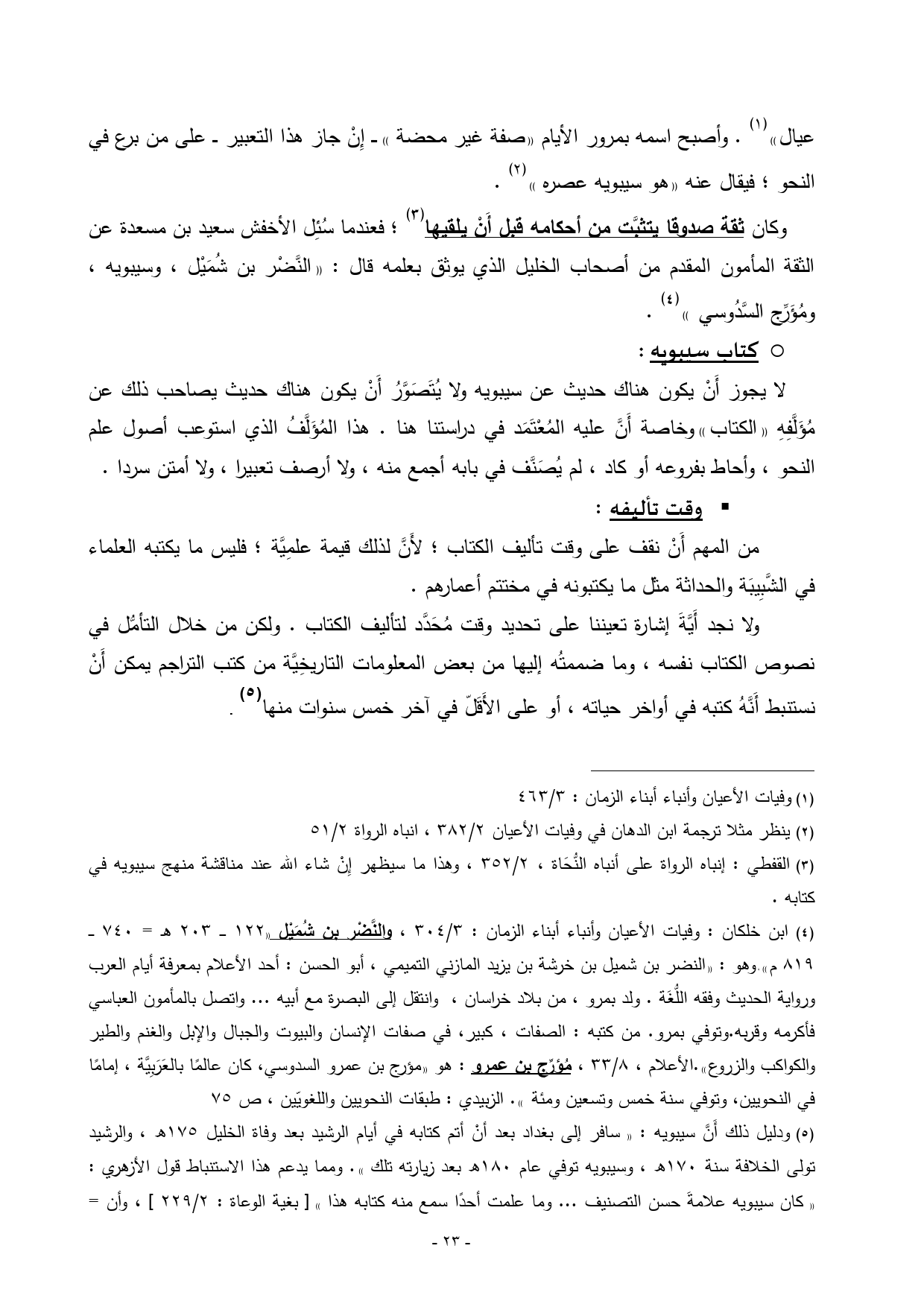 (¬5) ودليل ذلك أَنَّ سيبويه: ((سافر إلى بغداد بعد أنْ أتم كتابه في أيام الرشيد بعد وفاة الخليل 175 هـ، والرشيد تولى الخلافة سنة 170 هـ، وسيبويه توفي عام 180 هـ بعد زيارته تلك)). ومما يدعم هذا الاستنباط قول الأزهري: