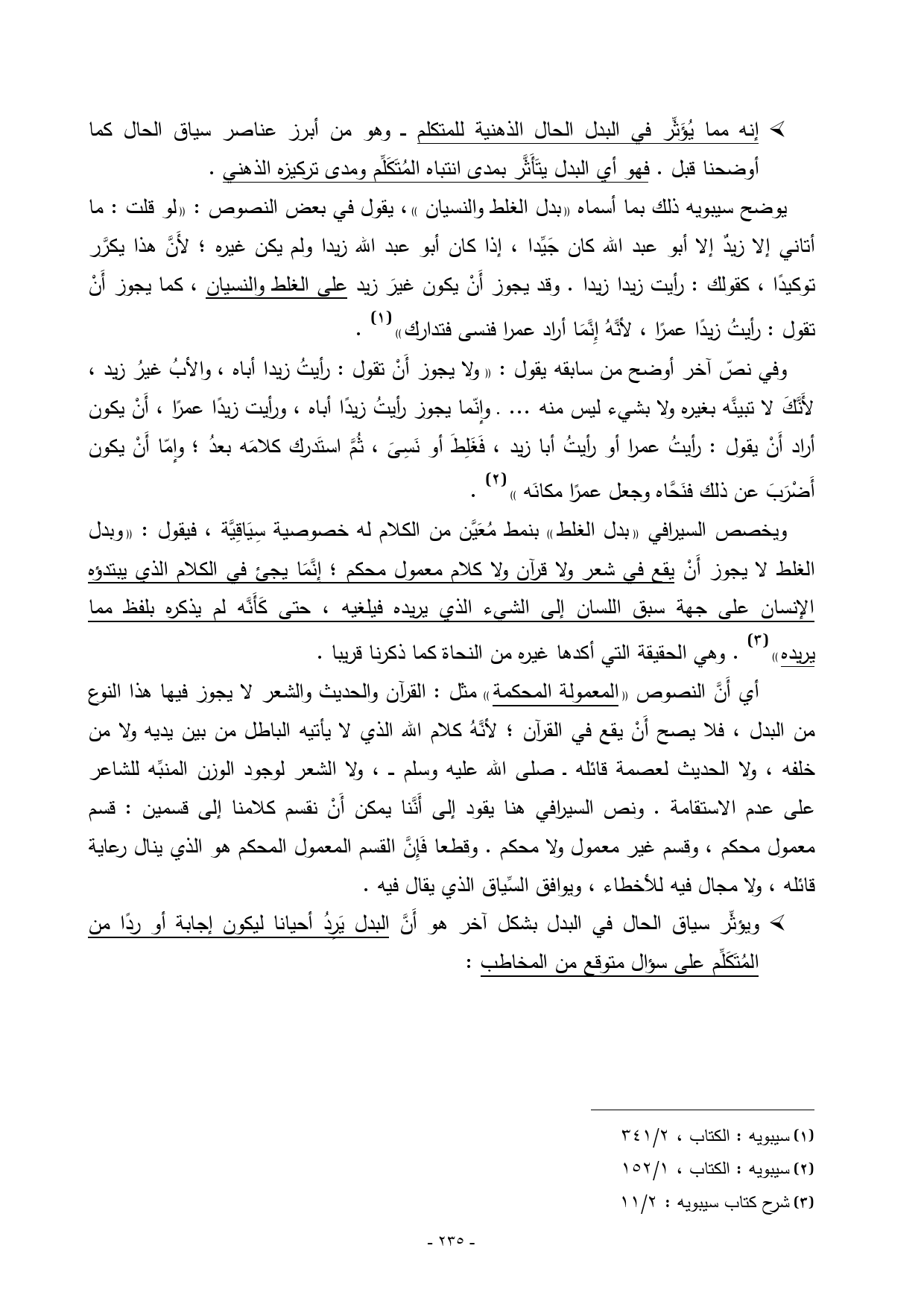 أي أَنَّ النصوص «المعمولة المحكمة» مثل: القرآن والحديث والشعر لا يجوز فيها هذا النوع من البدل، فلا يصح أَنْ يقع في القرآن؛ لأنَّهُ كلام الله الذي لا يأتيه الباطل من بين يديه ولا من خلفه، ولا الحديث لعصمة قائله ــ صلى الله عليه وسلم ـــ، ولا الشعر لوجود الوزن المنبِّه للشاعر على عدم الاستقامة. ونص السيرافي هنا يقود إلى أَنَّنا يمكن أَنْ نقسم كلامنا إلى قسمين: قسم معمول محكم، وقسم غير معمول ولا محكم. وقطعا فَإِنَّ القسم المعمول المحكم هو الذي ينال رعاية قائله، ولا مجال فيه للأخطاء، ويوافق السِّياق الذي يقال فيه.