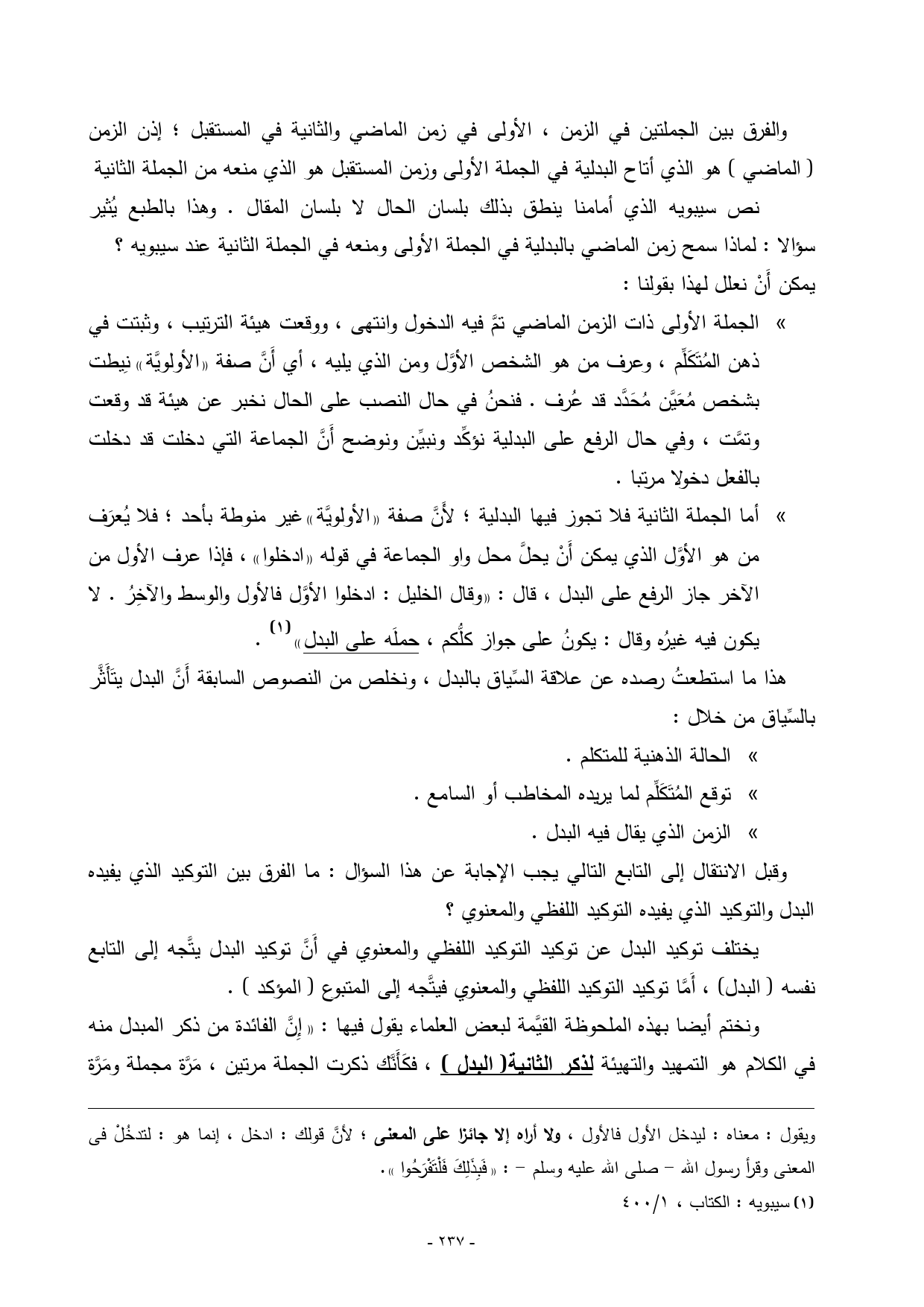 » أما الجملة الثانية فلا تجوز فيها البدلية؛ لأَنَّ صفة «الأولويَّة» غير منوطة بأحد؛ فلا يُعرَف من هو الأوَّل الذي يمكن أَنْ يحلَّ محل واو الجماعة في قوله «ادخلوا»، فإذا عرف الأول من الآخر جاز الرفع على البدل، قال: «وقال الخليل: ادخلوا الأوَّل فالأول والوسط والآخِرُ. لا يكون فيه غيرُه وقال: يكونُ على جواز كلُّكم، حملَه على البدل») (¬1).