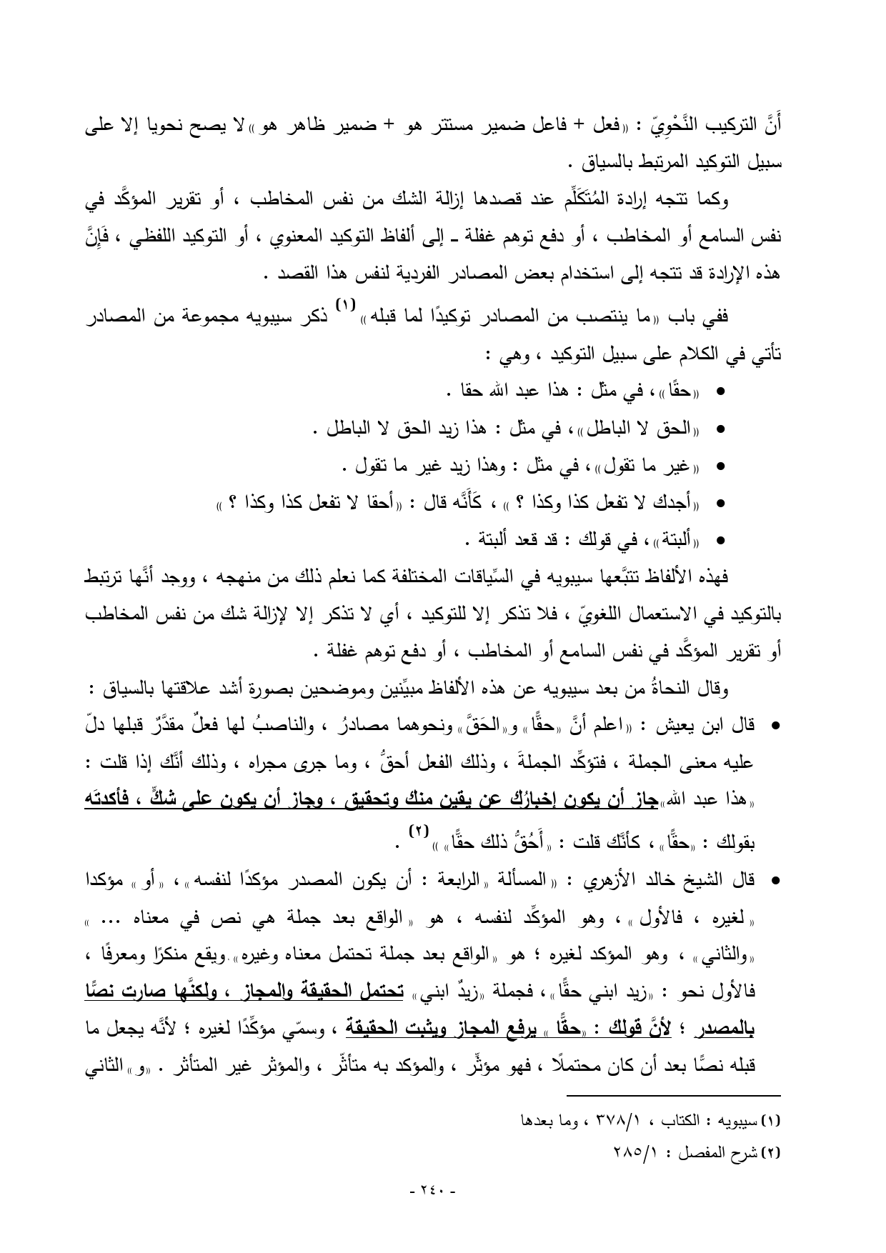 - قال ابن يعيش: «اعلم أنَّ ((حقًّا)) و ((الحَقَّ)) ونحوهما مصادرُ، والناصبُ لها فعلٌ مقدَّرٌ قبلها دلّ عليه معنى الجملة، فتؤكِّد الجملةَ، وذلك الفعل أحقُّ، وما جرى مجراه، وذلك أنَّك إذا قلت: