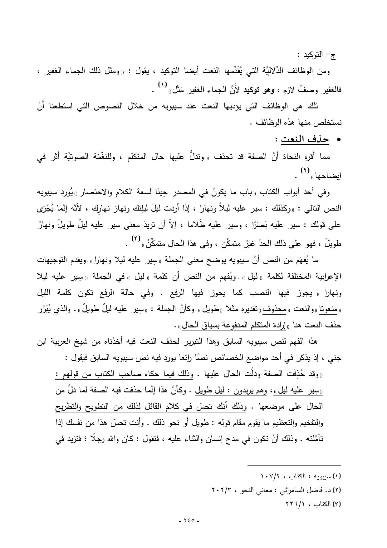 «منعوتا» والنعت «محذوف» تقديره مثلا «طويل»، وكأنَّ الجملة: «سِير عليه ليلٌ طويلٌ». والذي يُبَرِّر حذف النعت هنا «إرادة المتكلم المدفوعة بسياق الحال».