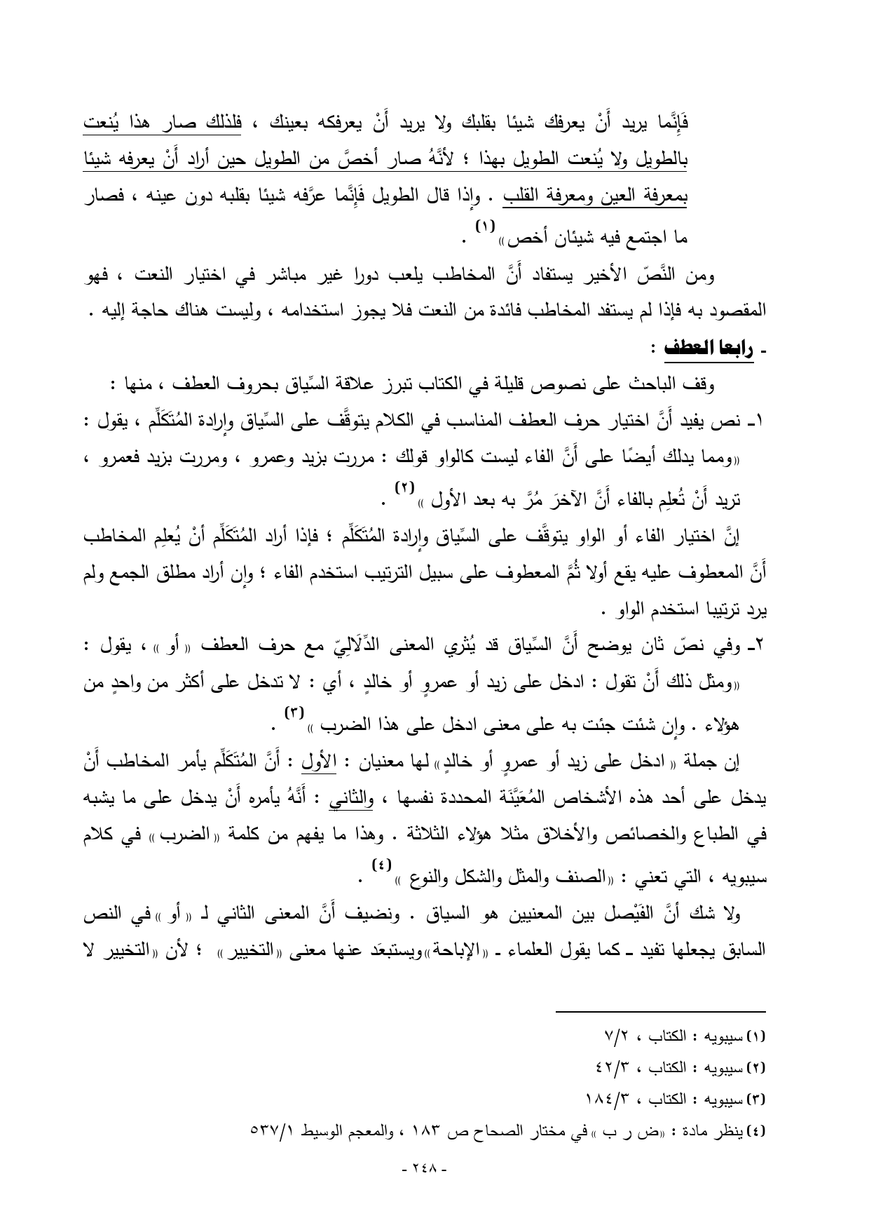 1 ــــ نص يفيد أَنَّ اختيار حرف العطف المناسب في الكلام يتوقَّف على السِّياق وإرادة المُتَكَلِّم، يقول: «ومما يدلك أيضًا على أَنَّ الفاء ليست كالواو قولك: مررت بزيد وعمرو، ومررت بزيد فعمرو، تريد أَنْ تُعلِم بالفاء أَنَّ الآخرَ مُرَّ به بعد الأول») (¬2).