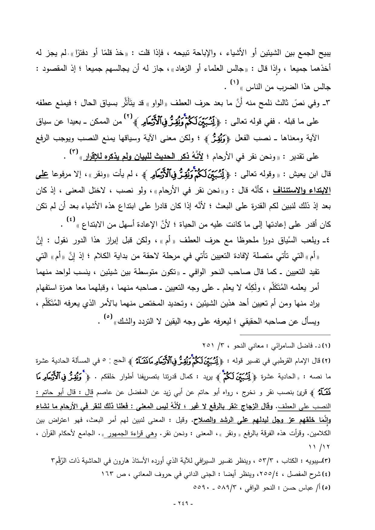 3 ــــ وفي نصّ ثالث نلمح منه أَنَّ ما بعد حرف العطف «الواو» قد يتَأَثَّر بسياق الحال؛ فيمنع عطفه على ما قبله. ففي قوله تعالى: {لِنُبَيِّنَ لَكُمْ وَنُقِرُّ فِي الْأَرْحَامِ} (¬2) من الممكن ــــ بعيدا عن سياق الآية ومعناها ــــ نصب الفعل {وَنُقِرُّ}؛ ولكن معنى الآية وسياقها يمنع النصب ويوجب الرفع على تقدير: «ونحن نقر في الأرحام؛ لأنَّهُ ذكر الحديث للبيان ولم يذكره للإقرار») (¬3).