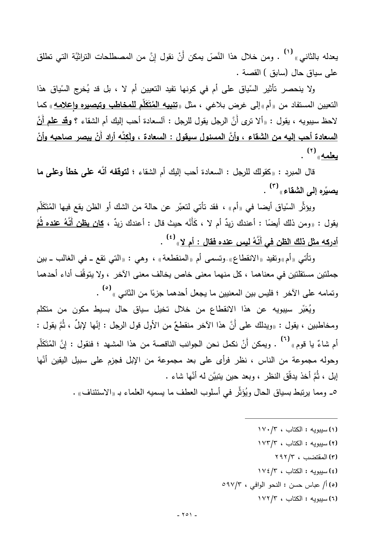 ومخاطبين، يقول: «ويدلك على أَنَّ هذا الآخر منقطعٌ من الأول قول الرجل: إنِّها لإبلٌ، ثُمَّ يقول: أم شاءٌ يا قوم») (¬6). ويمكن أَنْ نكمل نحن الجوانب الناقصة من هذا المشهد؛ فنقول: إِنَّ المُتَكَلِّم وحوله مجموعة من الناس، نظر فرأى على بعد مجموعة من الإبل فجزم على سبيل اليقين أنَّها إبل، ثُمَّ أخذ يدقِّق النظر، وبعد حين يتبيَّن له أنَّها شاء.