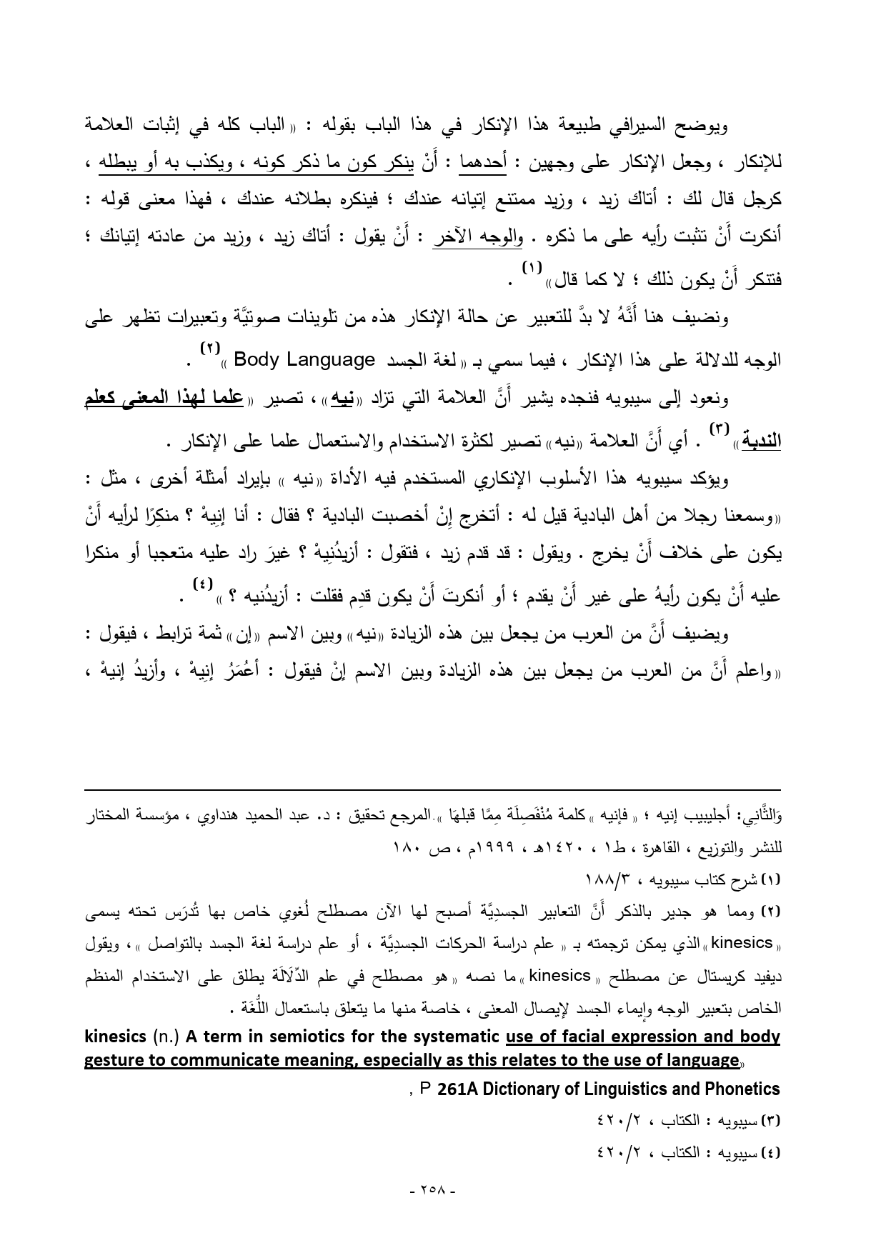 ونضيف هنا أَنَّهُ لا بدَّ للتعبير عن حالة الإنكار هذه من تلوينات صوتيَّة وتعبيرات تظهر على الوجه للدلالة على هذا الإنكار، فيما سمي بـ «لغة الجسد Body Language») (¬2) .