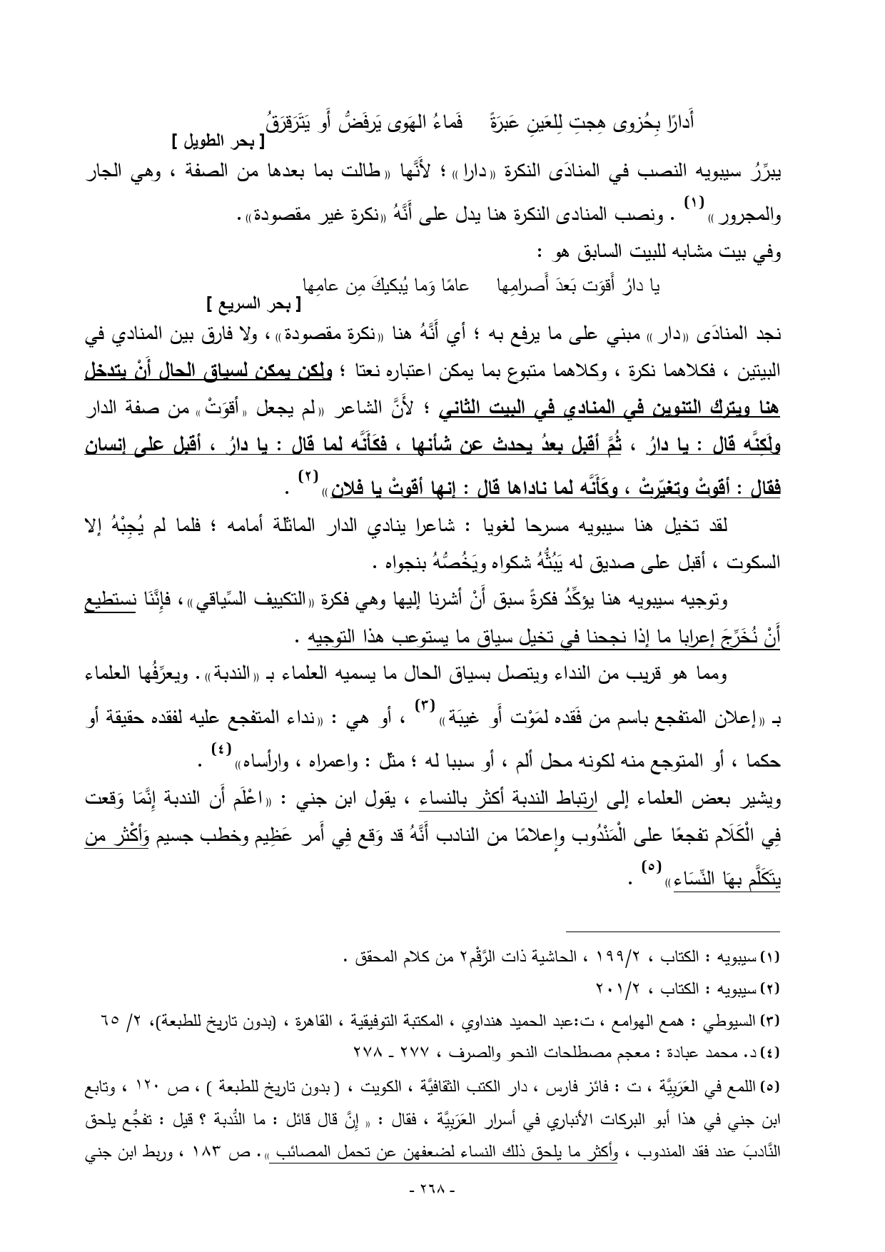 (¬5) اللمع في العَرَبِيَّة، ت: فائز فارس، دار الكتب الثقافيَّة، الكويت، ) بدون تاريخ للطبعة (، ص 120، وتابع ابن جني في هذا أبو البركات الأنباري في أسرار العَرَبِيَّة، فقال: ((إِنَّ قال قائل: ما النُّدبة؟ قيل: تفجُّع يلحق النَّادبَ عند فقد المندوب، وأكثر ما يلحق ذلك النساء لضعفهن عن تحمل المصائب)). ص 183، وربط ابن جني والأنباري هذا الأسلوب في غالب استعمالاته بالنساء يدل على أن علماءنا القدامي ــــ وليس سيبويه فقط ــ كانوا يتتبعون التراكيب النَّحْوِيَّة في سياقاتها المختلفة، ويحددون الدلالات السِّياقيَّة العامة المرتبطة بهذا التركيب، وليس هذا فقط بل أنهم يحددون أي الجنسين من النساء والرجال يختص بهذا الأسلوب أو التركيب. ويشير هذا الكلام أيضا أن طبيعة المُتَكَلِّم من حيث كونه ذكرا أو أنثى قد يؤثِّر على الكلام.