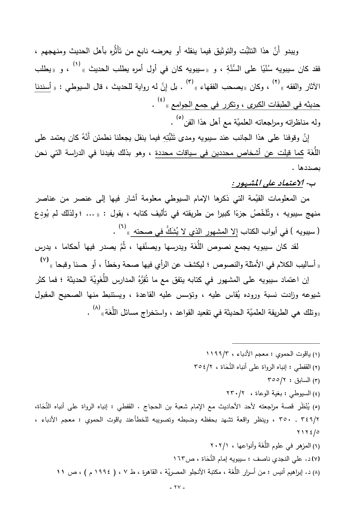 إِنَّ وقوفنا على هذا الجانب عند سيبويه ومدى تَثَبُّتِهِ فيما ينقل يجعلنا نطمئن أَنَّهُ كان يعتمد على اللُّغَة كما قيلت عن أشخاص محددين في سياقات محددة، وهو بذلك يفيدنا في الدراسة التي نحن بصددها.