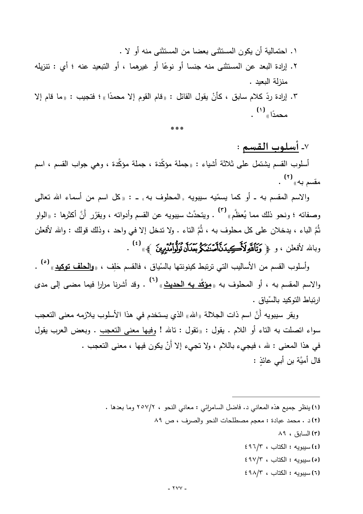 وأسلوب القسم من الأساليب التي ترتبط كينونتها بالسِّياق، فالقسم حَلِف، «والحلف توكيد») (¬5). والاسم المقسم به، أو المحلوف به «مؤكَّد به الحديث») (¬6). وقد أشرنا مرارا فيما مضى إلى مدى ارتباط التوكيد بالسِّياق.