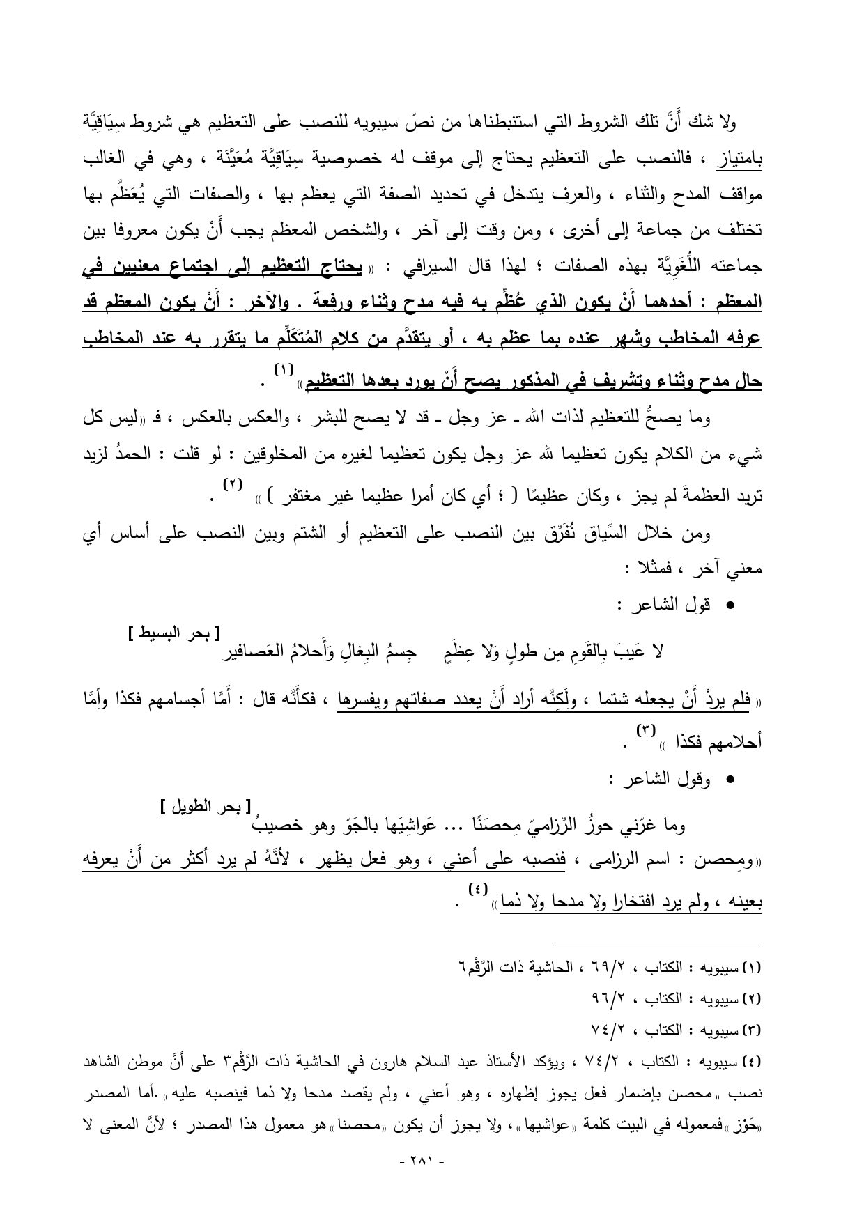 (¬4) سيبويه: الكتاب، 2/ 74، ويؤكد الأستاذ عبد السلام هارون في الحاشية ذات الرَّقْم 3 على أنَّ موطن الشاهد نصب ((محصن بإضمار فعل يجوز إظهاره، وهو أعني، ولم يقصد مدحا ولا ذما فينصبه عليه)). أما المصدر
