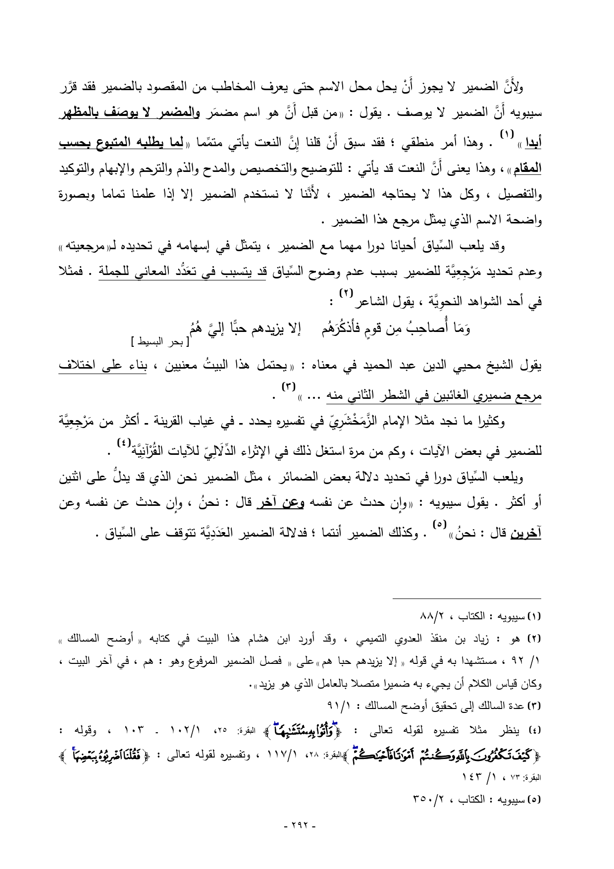 ولأَنَّ الضمير لا يجوز أَنْ يحل محل الاسم حتى يعرف المخاطب من المقصود بالضمير فقد قرَّر سيبويه أَنَّ الضمير لا يوصف. يقول: «من قبل أَنَّ هو اسم مضمَر والمضمر لا يوصَف بالمظهر أبدا») (¬1). وهذا أمر منطقي؛ فقد سبق أَنْ قلنا إِنَّ النعت يأتي متمِّما «لما يطلبه المتبوع بحسب المقام»، وهذا يعنى أَنَّ النعت قد يأتي: للتوضيح والتخصيص والمدح والذم والترحم والإبهام والتوكيد والتفصيل، وكل هذا لا يحتاجه الضمير، لأَنَّنا لا نستخدم الضمير إلا إذا علمنا تماما وبصورة واضحة الاسم الذي يمثل مرجع هذا الضمير.