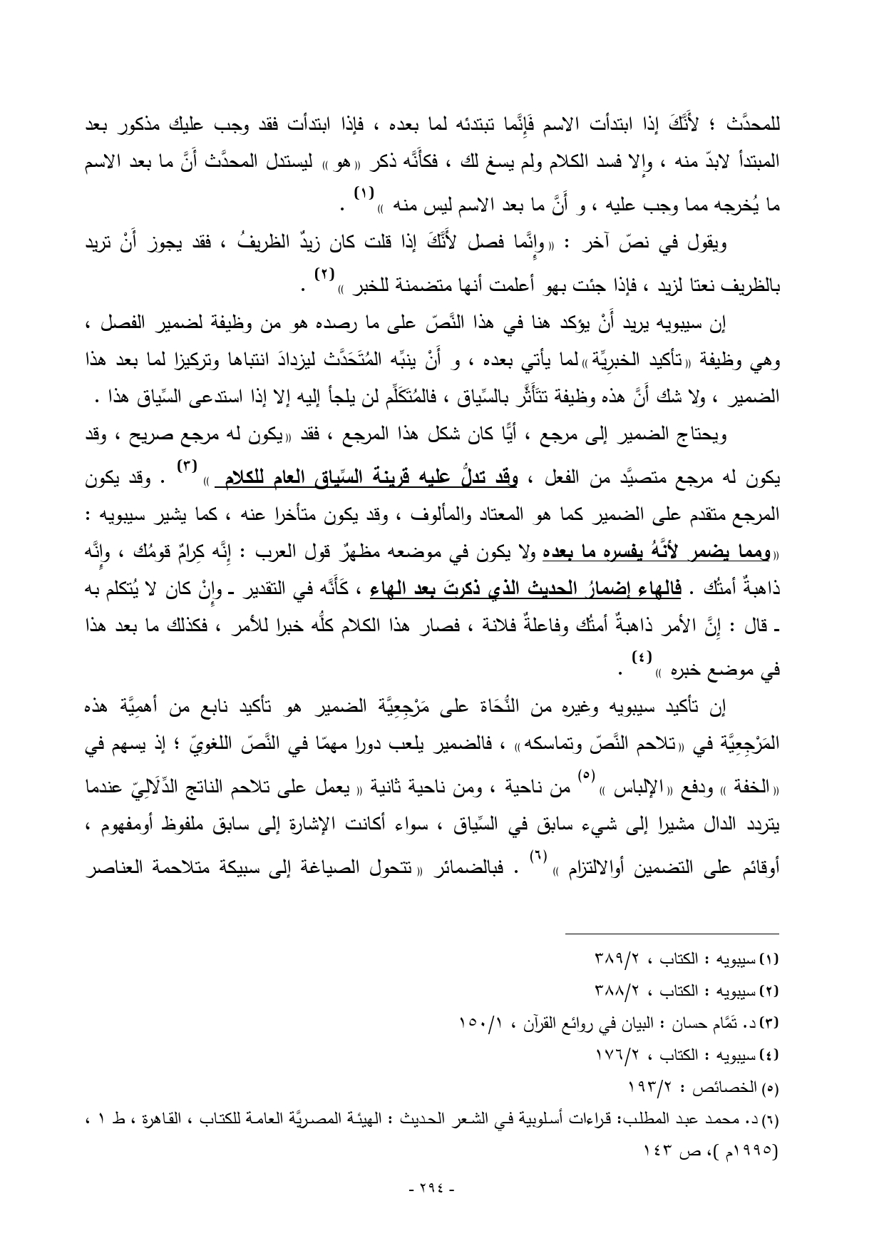 إن تأكيد سيبويه وغيره من النُّحَاة على مَرْجِعِيَّة الضمير هو تأكيد نابع من أهمِيَّة هذه المَرْجِعِيَّة في «تلاحم النَّصّ وتماسكه»، فالضمير يلعب دورا مهمّا في النَّصّ اللغويّ؛ إذ يسهم في