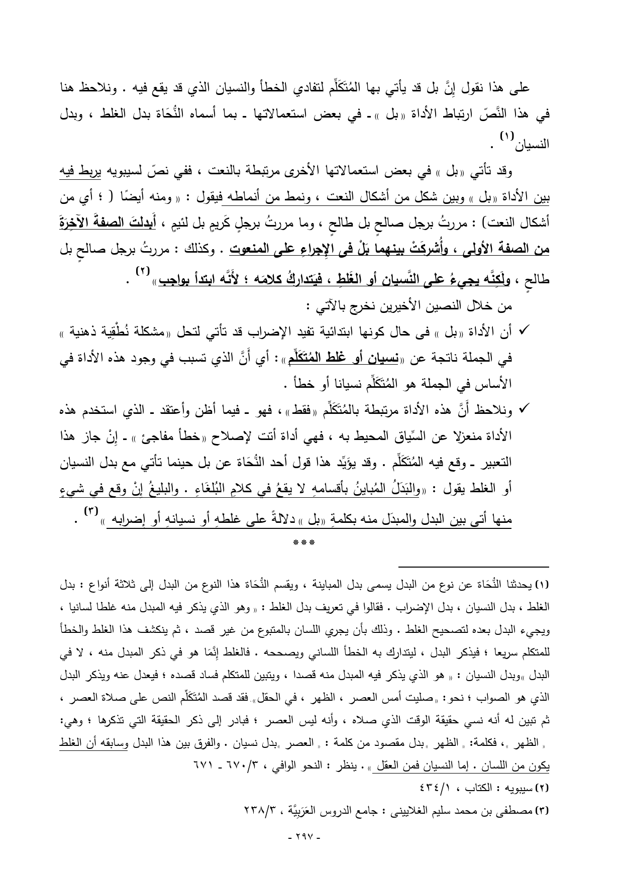 على هذا نقول إِنَّ بل قد يأتي بها المُتَكَلِّم لتفادي الخطأ والنسيان الذي قد يقع فيه. ونلاحظ هنا في هذا النَّصّ ارتباط الأداة «بل» ـــ في بعض استعمالاتها ـــ بما أسماه النُّحَاة بدل الغلط، وبدل النسيان) (¬1).
