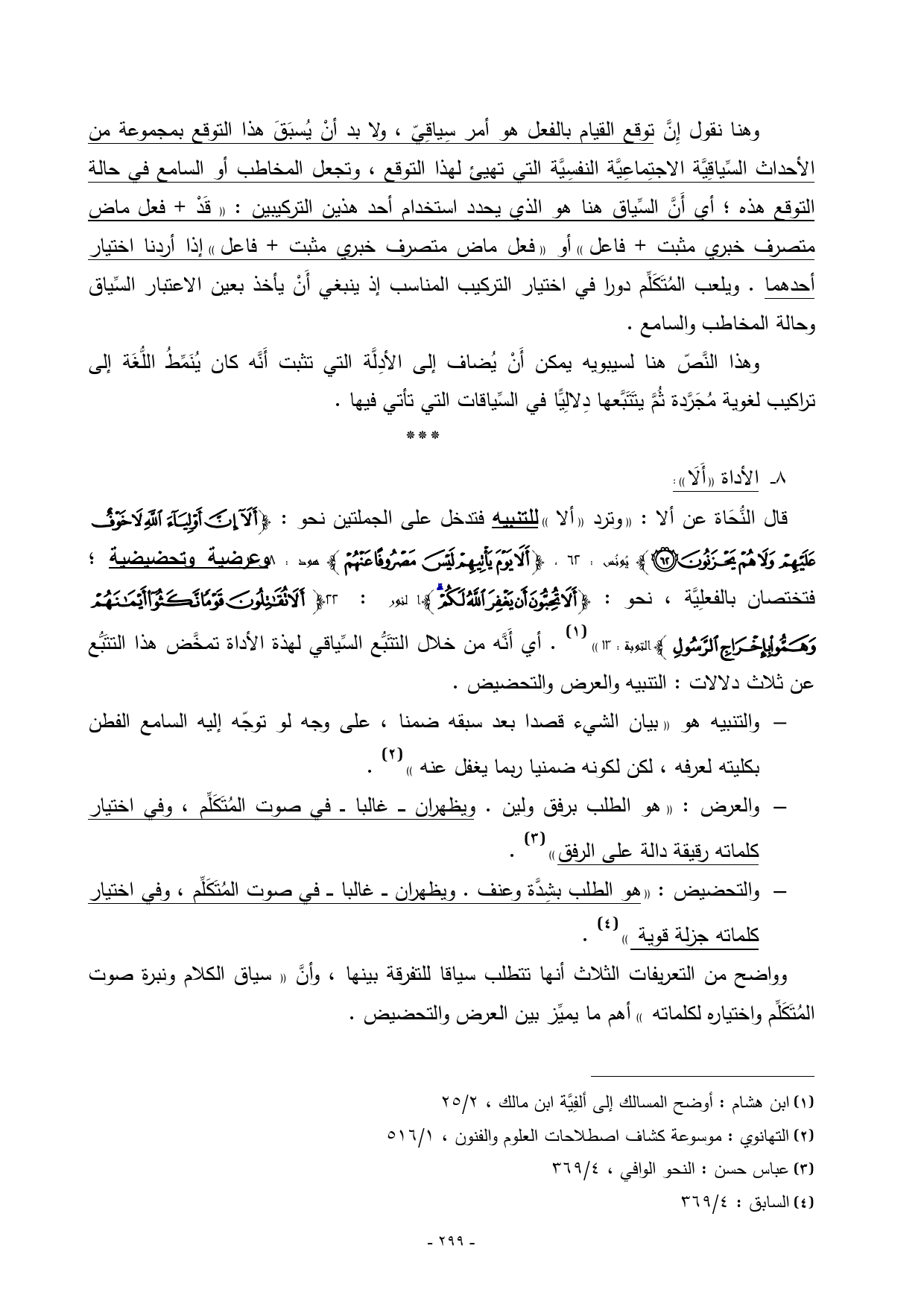 قال النُّحَاة عن ألا: «وترد «ألا» للتنبيه فتدخل على الجملتين نحو: {أَلَا إِنَّ أَوْلِيَاءَ اللَّهِ لَا خَوْفٌ عَلَيْهِمْ وَلَا هُمْ يَحْزَنُونَ (62)} يُونُس: 62، {أَلَا يَوْمَ يَأْتِيهِمْ لَيْسَ مَصْرُوفًا عَنْهُمْ} هود: 8 وعرضية وتحضيضية؛