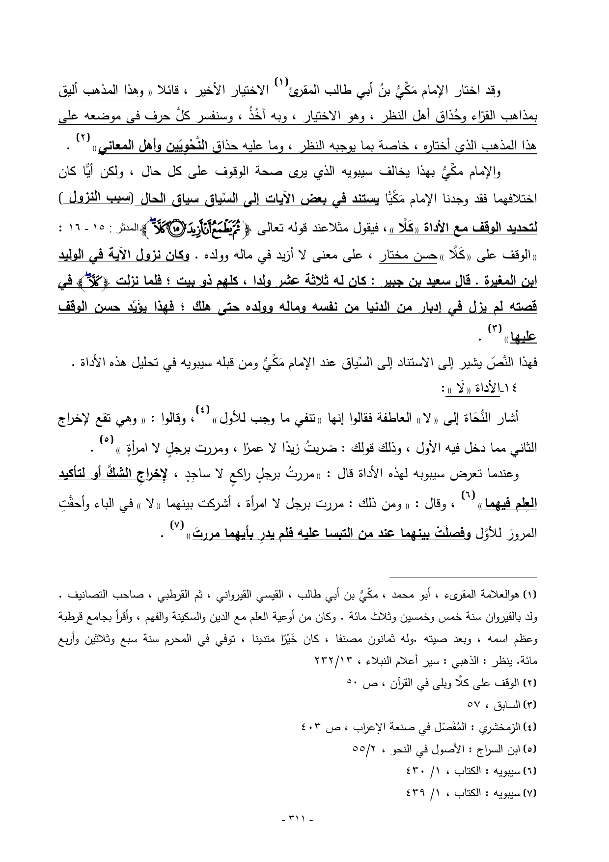 والإمام مكِّيُّ بهذا يخالف سيبويه الذي يرى صحة الوقوف على كل حال، ولكن أيًّا كان اختلافهما فقد وجدنا الإمام مَكِّيًّا يستند في بعض الآيات إلى السِّياق سياق الحال) سبب النزول (لتحديد الوقف مع الأداة «كَلَّا»، فيقول مثلاعند قوله تعالى {ثُمَّ يَطْمَعُ أَنْ أَزِيدَ (15) كَلَّا} المدثر: 15 - 16: «الوقف على «كَلَّا» حسن مختار، على معنى لا أزيد في ماله وولده. وكان نزول الآية في الوليد ابن المغيرة. قال سعيد بن جبير: كان له ثلاثة عشر ولدا، كلهم ذو بيت؛ فلما نزلت {كَلَّا} في قصته لم يزل في إدبار من الدنيا من نفسه وماله وولده حتى هلك؛ فهذا يؤَيِّد حسن الوقف