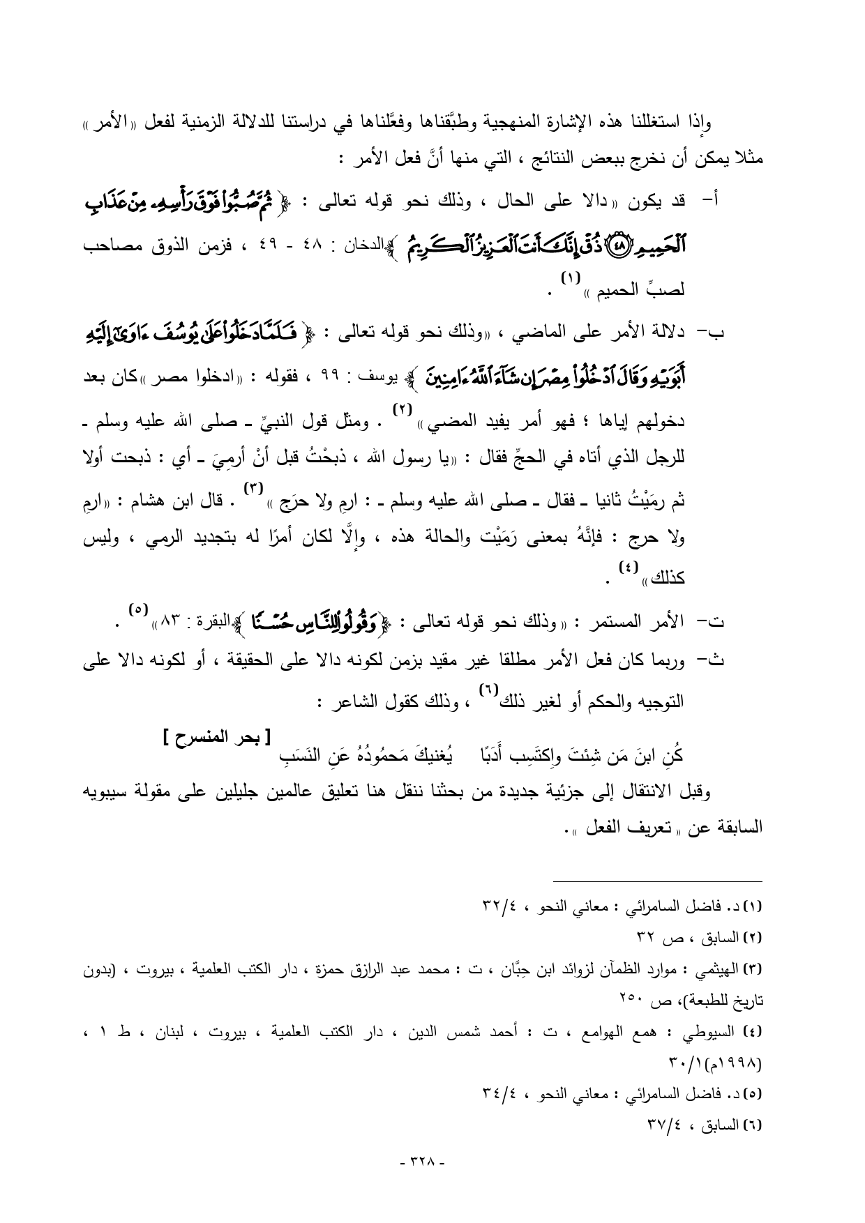 ت - الأمر المستمر: «وذلك نحو قوله تعالى: {وَقُولُوا لِلنَّاسِ حُسْنًا} البقرة: 83») (¬5).