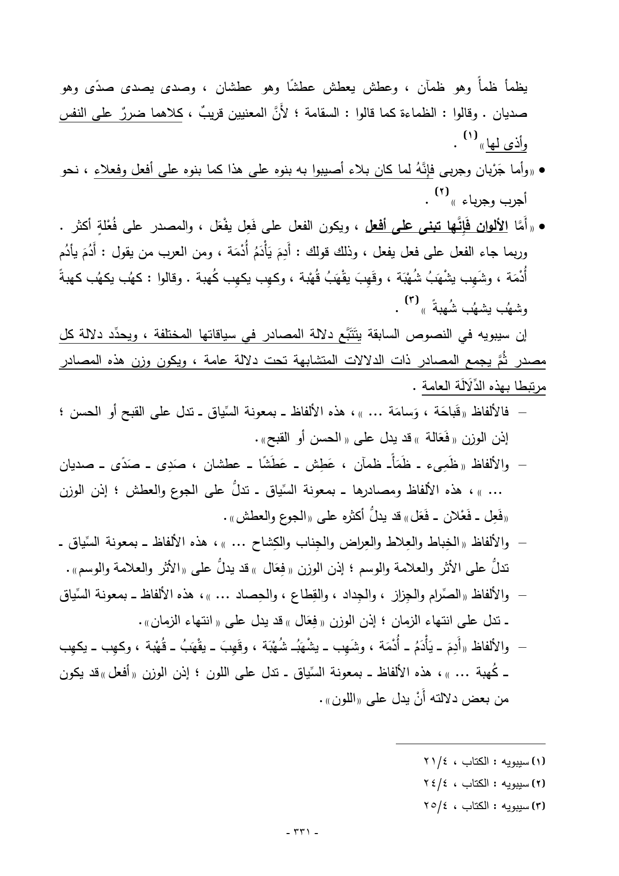 إن سيبويه في النصوص السابقة يتَتَبَّع دلالة المصادر في سياقاتها المختلفة، ويحدِّد دلالة كل مصدر ثُمَّ يجمع المصادر ذات الدلالات المتشابهة تحت دلالة عامة، ويكون وزن هذه المصادر مرتبطا بهذه الدِّلَالَة العامة.