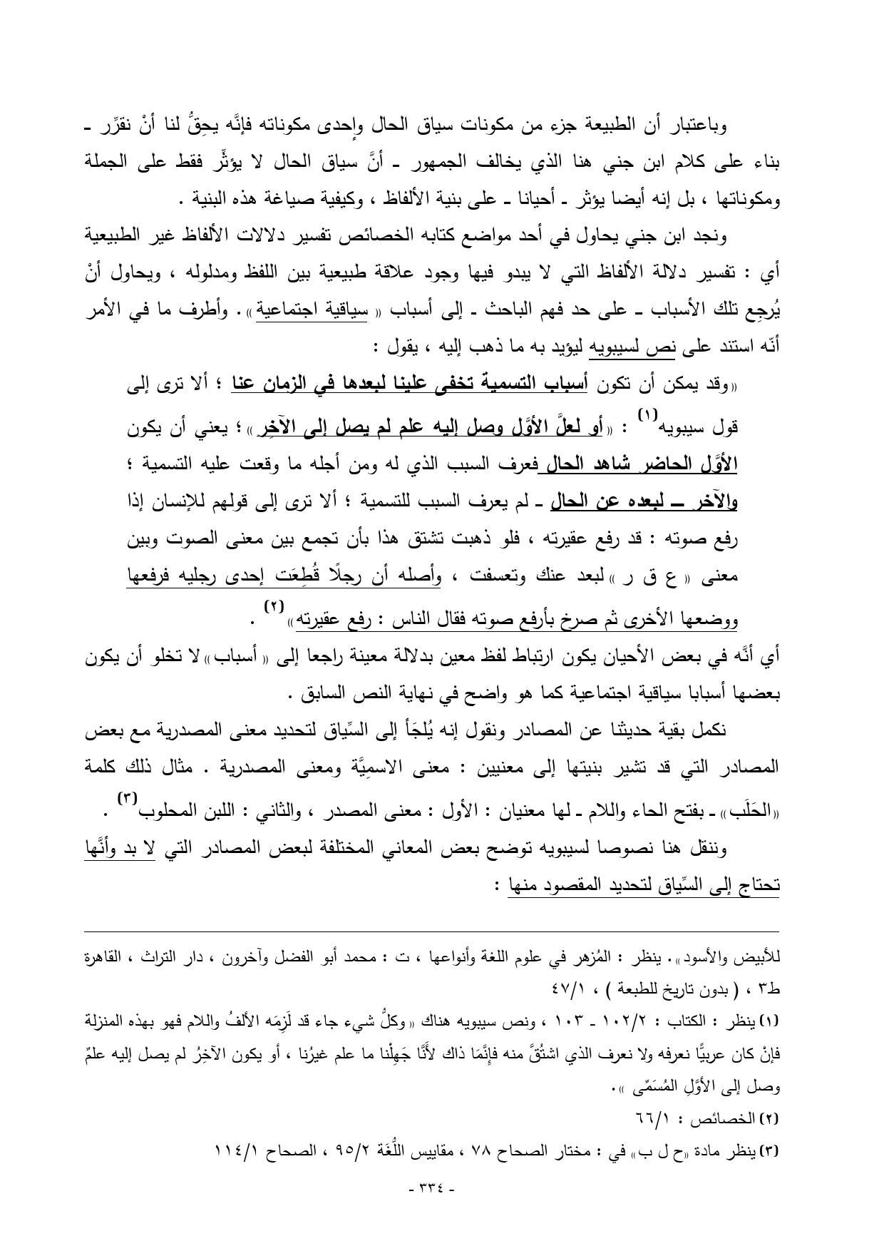 أي أنَّه في بعض الأحيان يكون ارتباط لفظ معين بدلالة معينة راجعا إلى «أسباب» لا تخلو أن يكون بعضها أسبابا سياقية اجتماعية كما هو واضح في نهاية النص السابق.