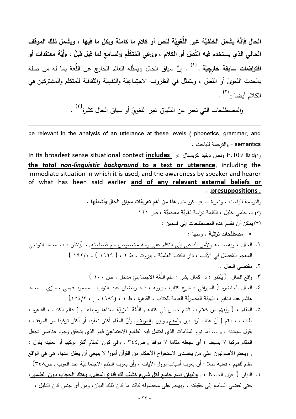 (¬1) P.109 Ibid ونص ديفيد كريستال: ((In its broadest sense situational context includes the total non-linguistic background to a text or utterance, including the immediate situation in which it is used, and the awareness by speaker and hearer of what has been said earlier and of any relevant external beliefs or presuppositions .. ))
