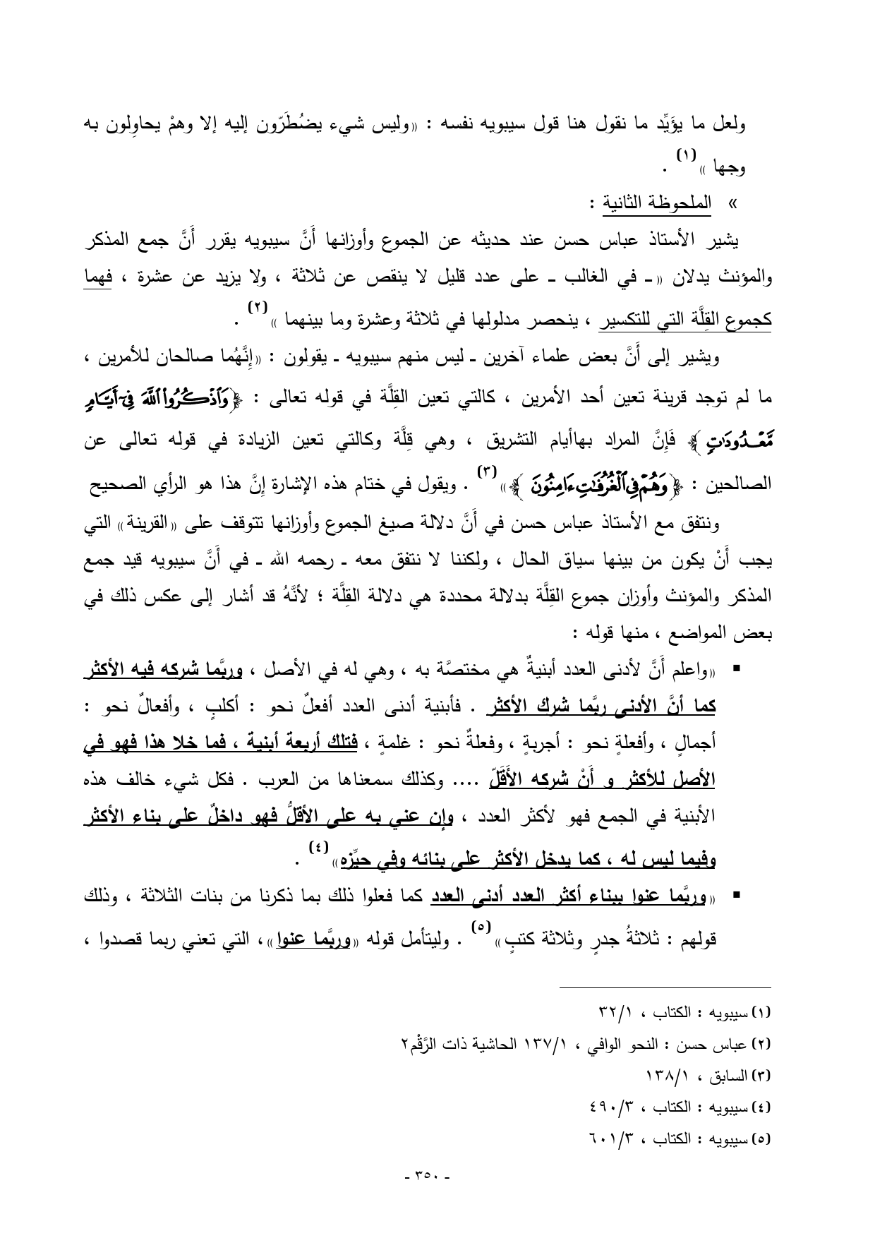 ونتفق مع الأستاذ عباس حسن في أَنَّ دلالة صيغ الجموع وأوزانها تتوقف على «القرينة» التي يجب أَنْ يكون من بينها سياق الحال، ولكننا لا نتفق معه ـــ رحمه الله ـــ في أَنَّ سيبويه قيد جمع المذكر والمؤنث وأوزان جموع القِلَّة بدلالة محددة هي دلالة القِلَّة؛ لأنَّهُ قد أشار إلى عكس ذلك في بعض المواضع، منها قوله: