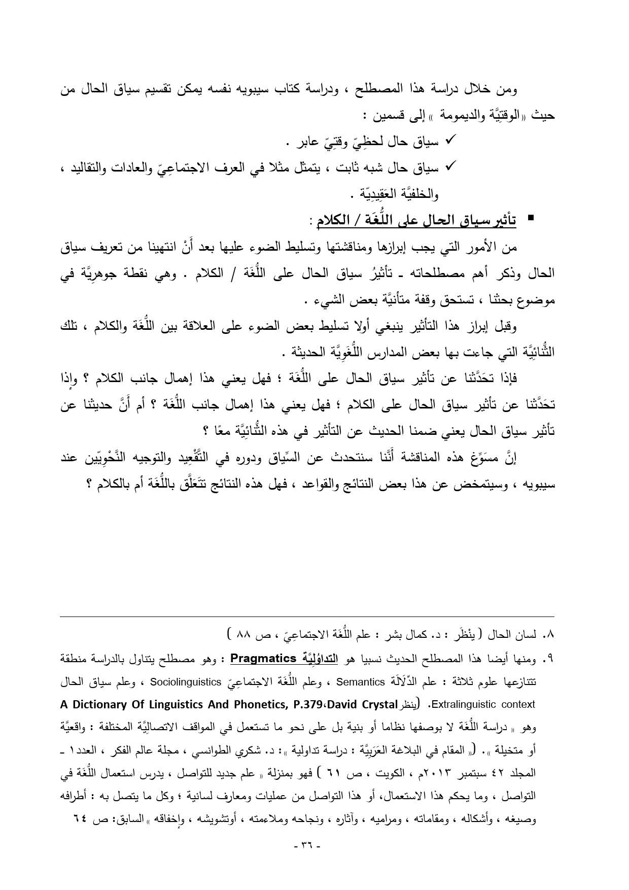 • تأثير سياق الحال على اللُّغَة / الكلام:
