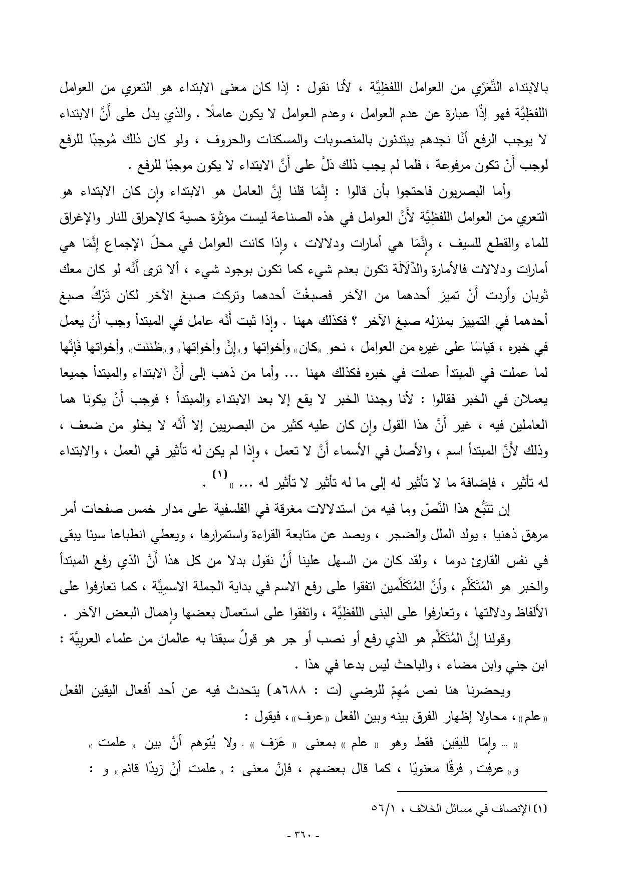 بالابتداء التَّعَرِّي من العوامل اللفظِيَّة، لأنا نقول: إذا كان معنى الابتداء هو التعري من العوامل اللفظِيَّة فهو إذًا عبارة عن عدم العوامل، وعدم العوامل لا يكون عاملًا. والذي يدل على أَنَّ الابتداء لا يوجب الرفع أنَّا نجدهم يبتدئون بالمنصوبات والمسكنات والحروف، ولو كان ذلك مُوجبًا للرفع لوجب أَنْ تكون مرفوعة، فلما لم يجب ذلك دَلَّ على أَنَّ الابتداء لا يكون موجبًا للرفع.