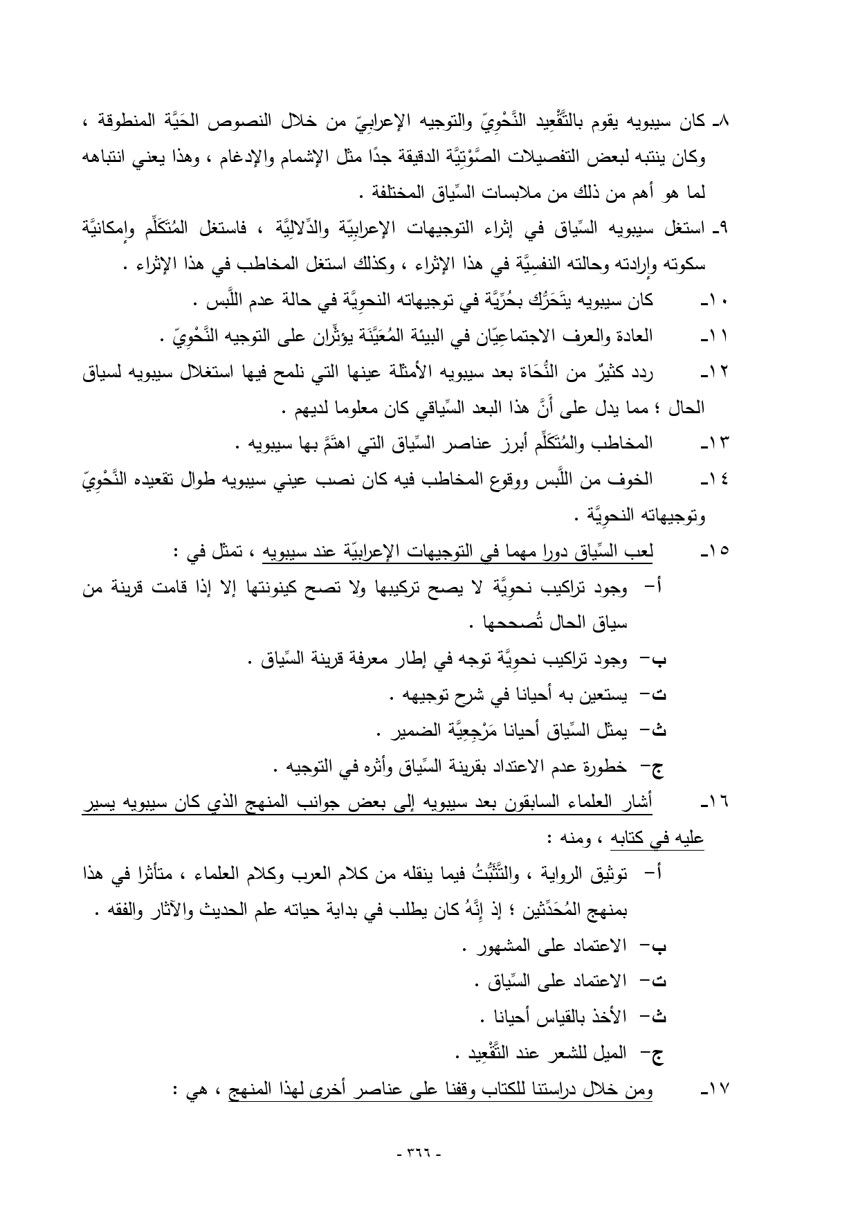 16 ــــ أشار العلماء السابقون بعد سيبويه إلى بعض جوانب المنهج الذي كان سيبويه يسير عليه في كتابه، ومنه: