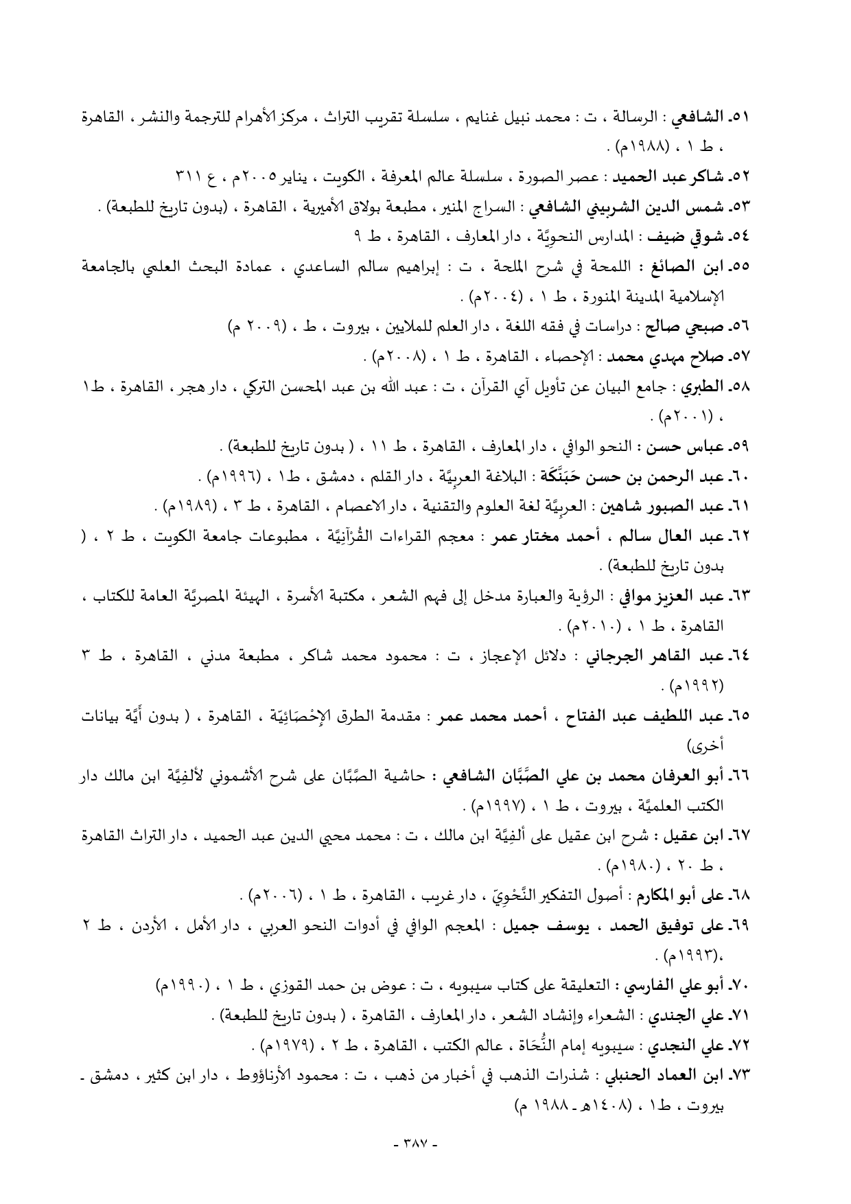 72 ـــ علي النجدي: سيبويه إمام النُّحَاة، عالم الكتب، القاهرة، ط 2، (1979 م).