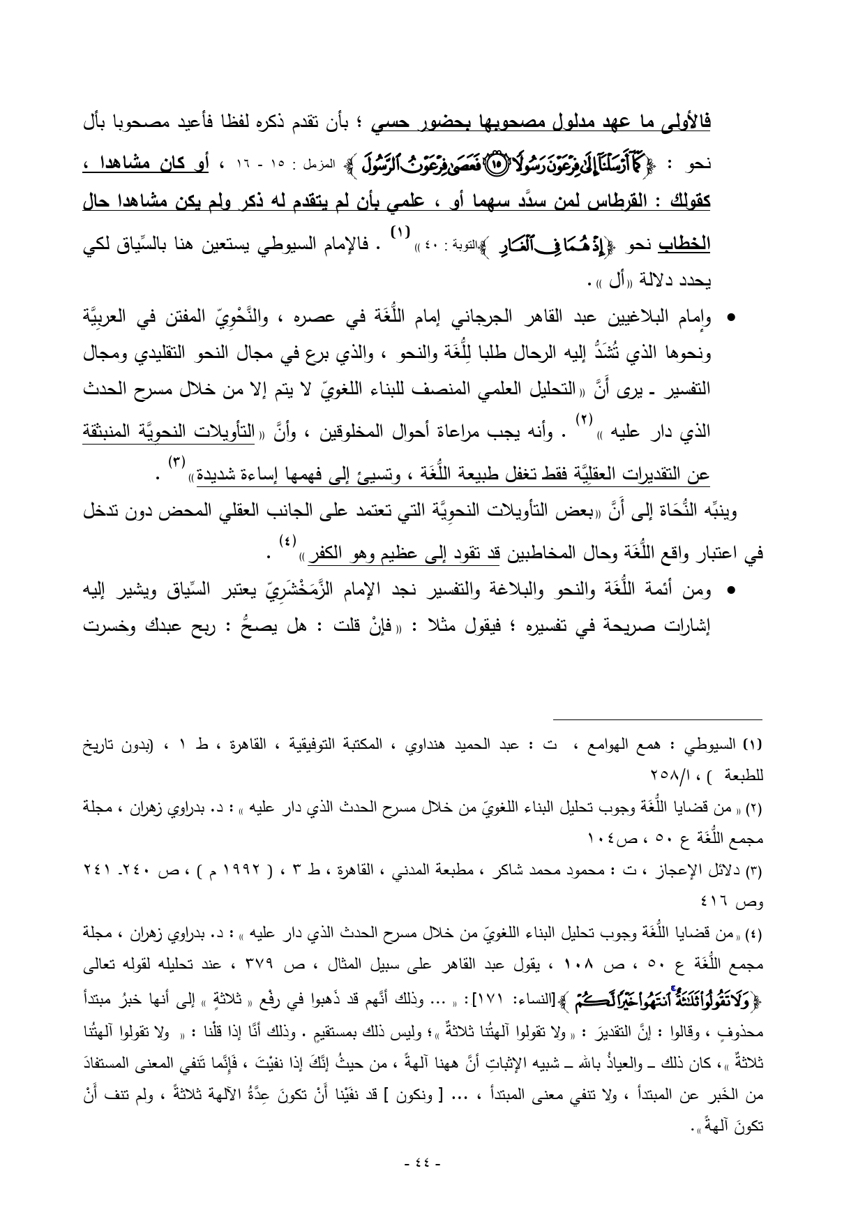 (¬4) (من قضايا اللُّغَة وجوب تحليل البناء اللغويّ من خلال مسرح الحدث الذي دار عليه)): د. بدراوي زهران، مجلة مجمع اللُّغَة ع 50، ص 108، يقول عبد القاهر على سبيل المثال، ص 379، عند تحليله لقوله تعالى {وَلَا تَقُولُوا ثَلَاثَةٌ انْتَهُوا خَيْرًا لَكُمْ} [النساء: 171] D: (( ... وذلك أنَّهم قد ذَهبوا في رفْع ((ثلاثةٍ)) إلى أنها خبرُ مبتدأ محذوفٍ، وقالوا: إنَّ التقديرَ: ((ولا تقولوا آلهتُنا ثلاثةٌ))؛ وليس ذلك بمستقيمٍ. وذلك أنَّا إذا قلْنا: ((ولا تقولوا آلهتُنا ثلاثةٌ))، كان ذلك ـــــ والعياذُ بالله ــــــ شبيه الإثباتِ أنَّ ههنا آلهةً، من حيثُ إنَّكَ إذا نفيْتَ، فَإِنَّما تَنفي المعنى المستفادَ من الخَبر عن المبتدأ، ولا تنفي معنى المبتدأ، ... [ونكون] قد نفَيْنا أَنْ تكونَ عِدَّةُ الآلهة ثلاثةً، ولم تنف أَنْ تكونَ آلهةً)).