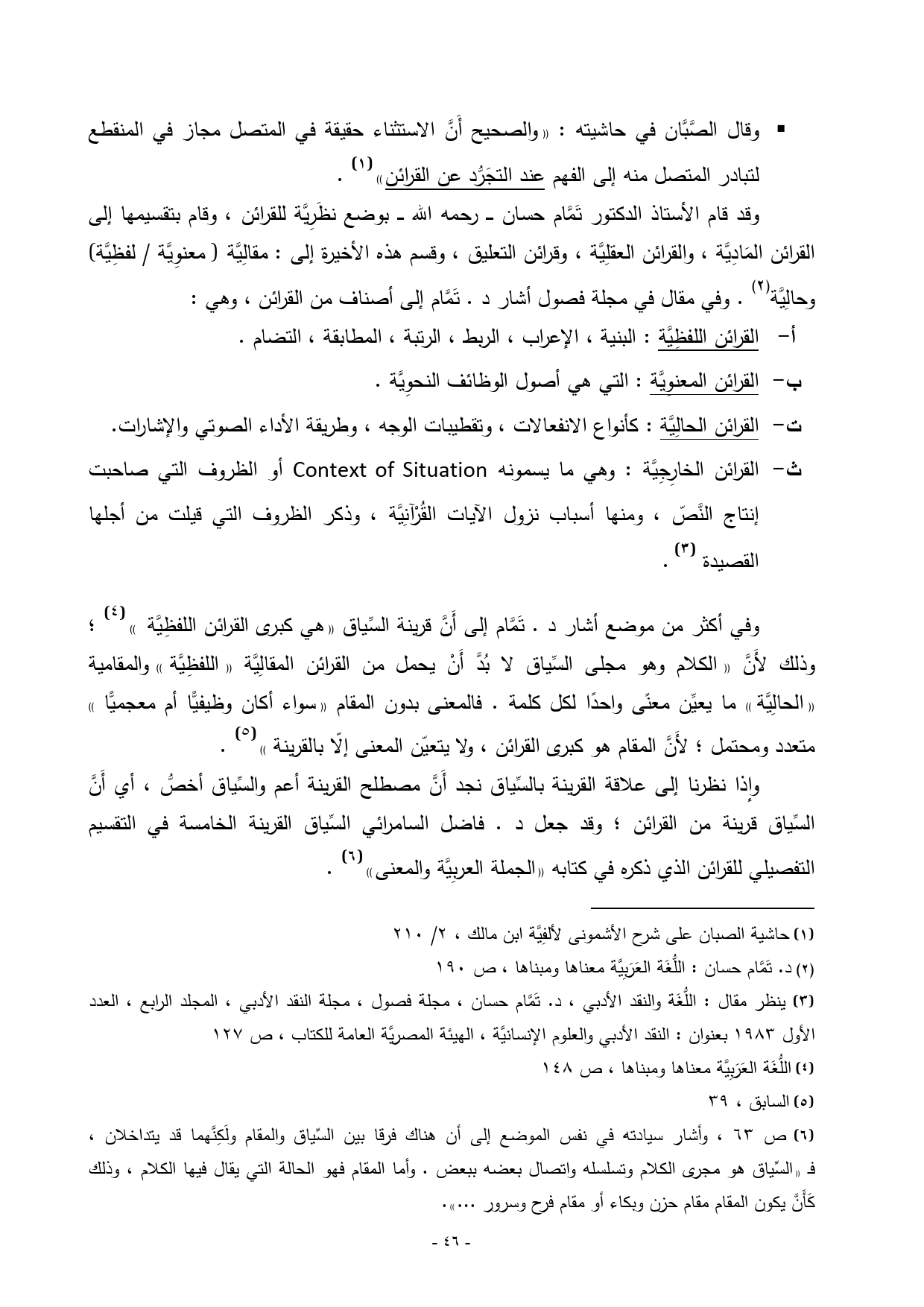 (¬6) ص 63، وأشار سيادته في نفس الموضع إلى أن هناك فرقا بين السِّياق والمقام ولَكِنَّهما قد يتداخلان،