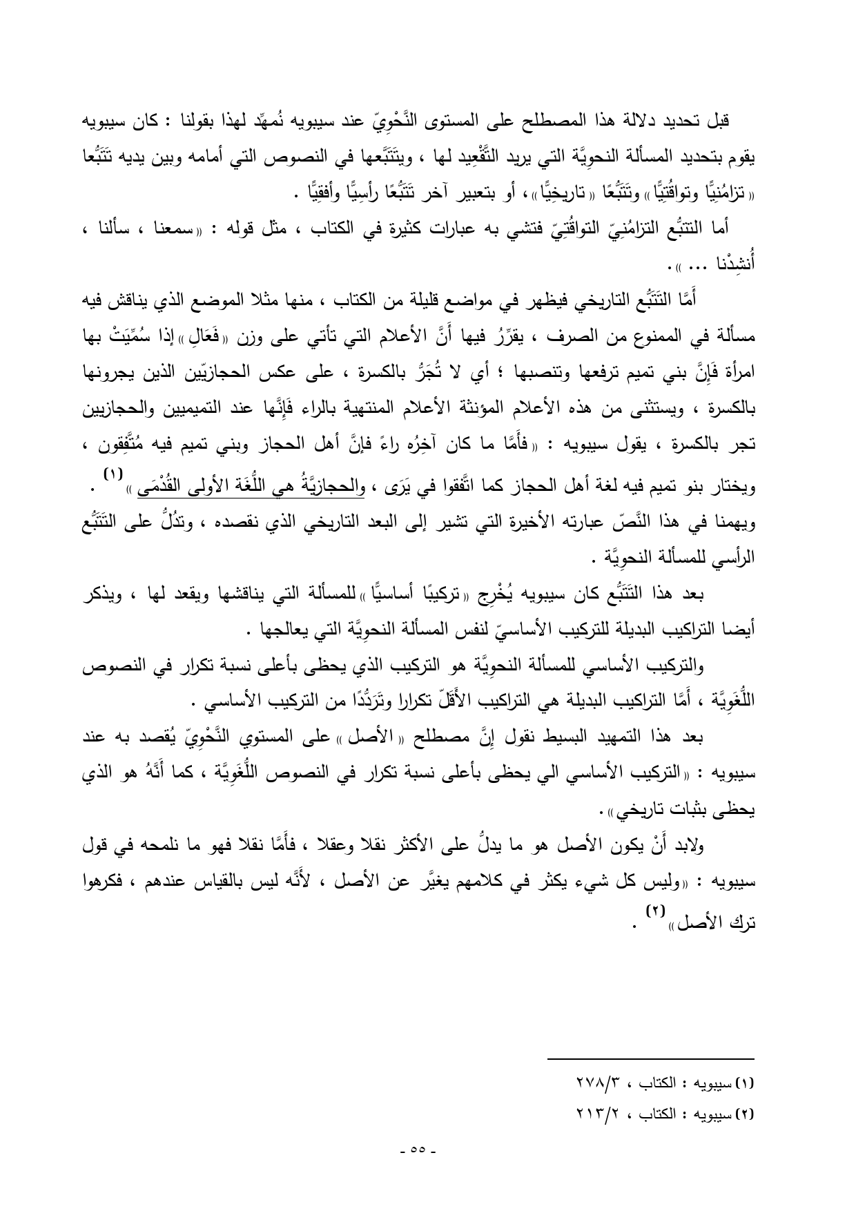 بعد هذا التمهيد البسيط نقول إِنَّ مصطلح «الأصل» على المستوي النَّحْوِيّ يُقصد به عند سيبويه: «التركيب الأساسي الي يحظى بأعلى نسبة تكرار في النصوص اللُّغَوِيَّة، كما أَنَّهُ هو الذي يحظى بثبات تاريخي».
