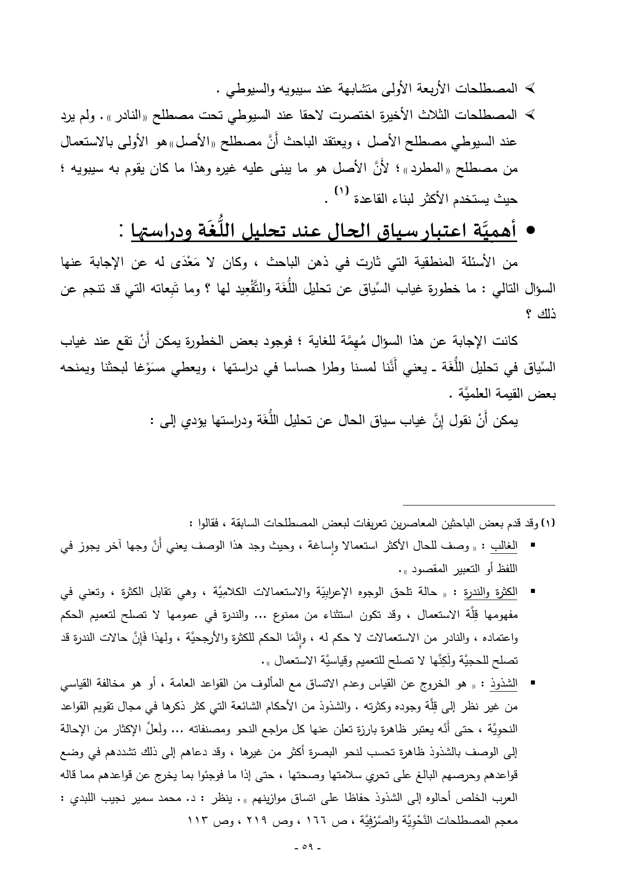 • ... الكثرة والندرة: ((حالة تلحق الوجوه الإعرابِيّة والاستعمالات الكلامِيَّة، وهي تقابل الكثرة، وتعني في مفهومها قِلَّة الاستعمال، وقد تكون استثناء من ممنوع ... والندرة في عمومها لا تصلح لتعميم الحكم واعتماده، والنادر من الاستعمالات لا حكم له، وإِنَّمَا الحكم للكثرة والأرجحيَّة، ولهذا فَإِنَّ حالات الندرة قد تصلح للحجيَّة ولَكِنَّها لا تصلح للتعميم وقياسيَّة الاستعمال)).