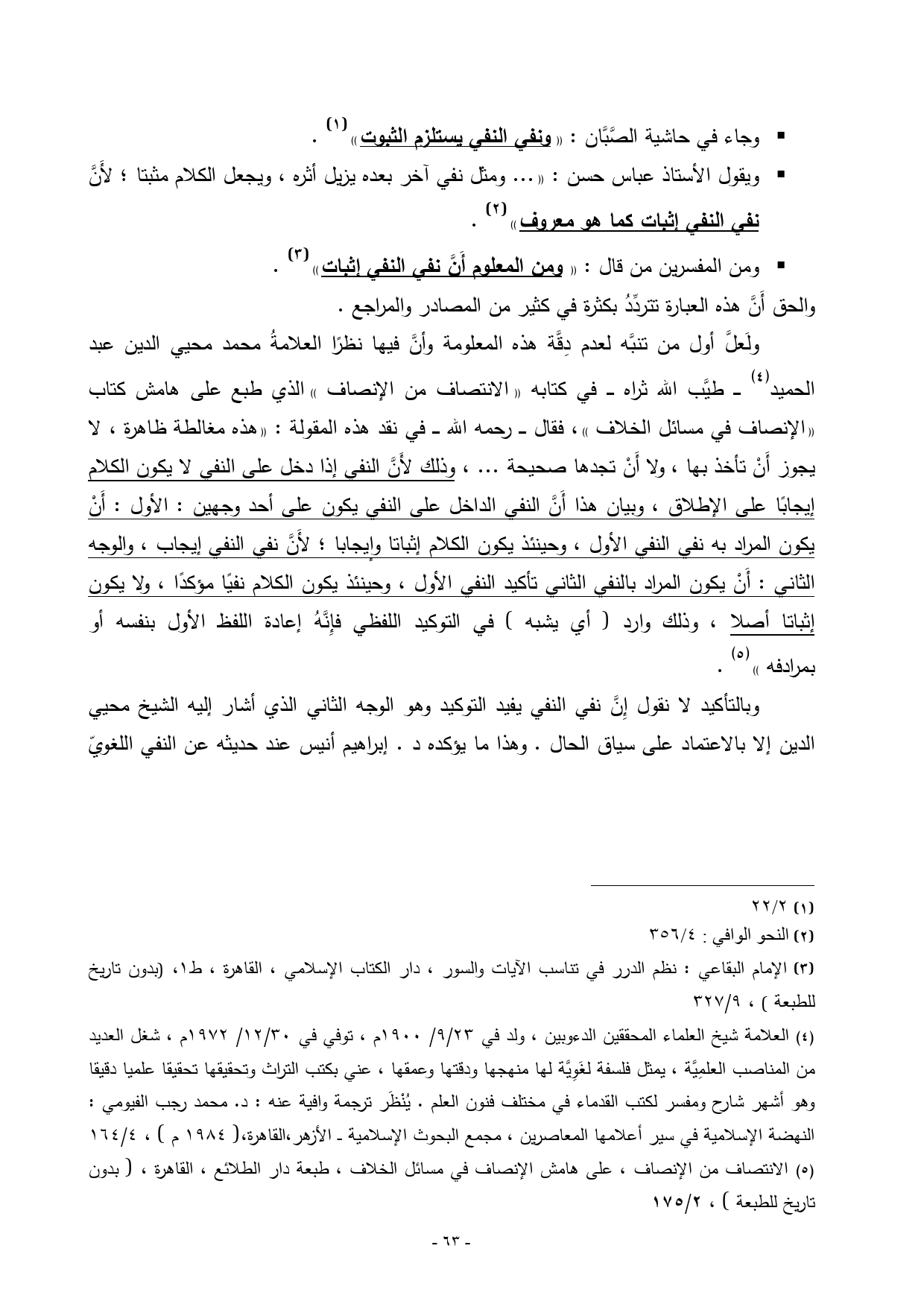 • ويقول الأستاذ عباس حسن: « ... ومثل نفي آخر بعده يزيل أثره، ويجعل الكلام مثبتا؛ لأَنَّ نفي النفي إثبات كما هو معروف») (¬2).