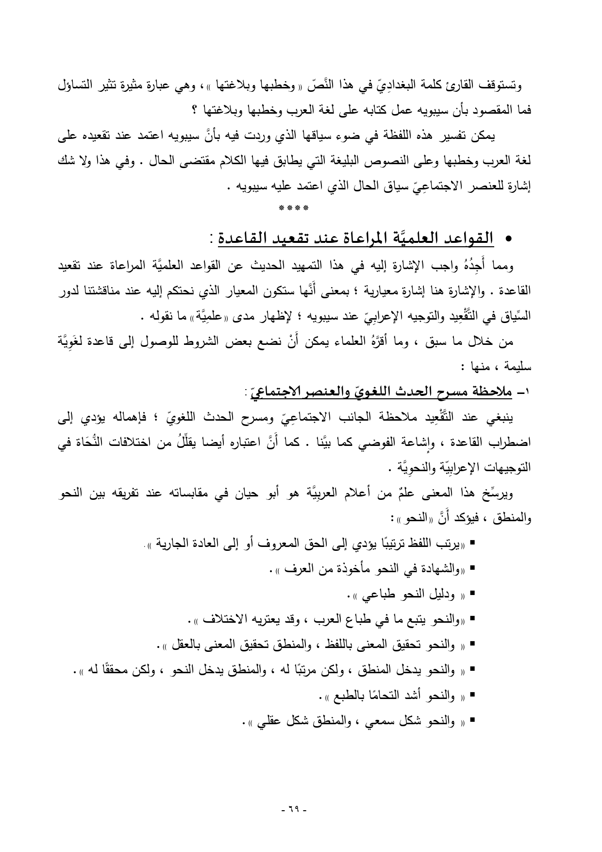 ويرسِّخ هذا المعنى علمٌ من أعلام العربِيَّة هو أبو حيان في مقابساته عند تفريقه بين النحو والمنطق، فيؤكد أَنَّ «النحو»: