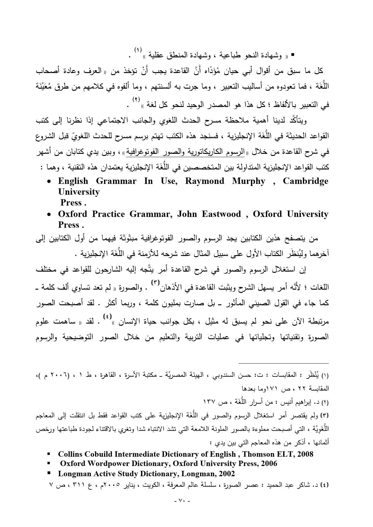 (¬3) ولم يقتصر أمر استغلال الرسوم والصور في اللُّغَة الإنجليزية على كتب القواعد فقط بل انتقلت إلى المعاجم اللُّغَوِيَّة، التي أصبحت مملوءة بالصور الملونة اللامعة التي تشد الانتباه شدا وتغري بالاقتناء لجودة طباعتها ورخص أثمانها، أذكر من هذه المعاجم التي بين يدي: