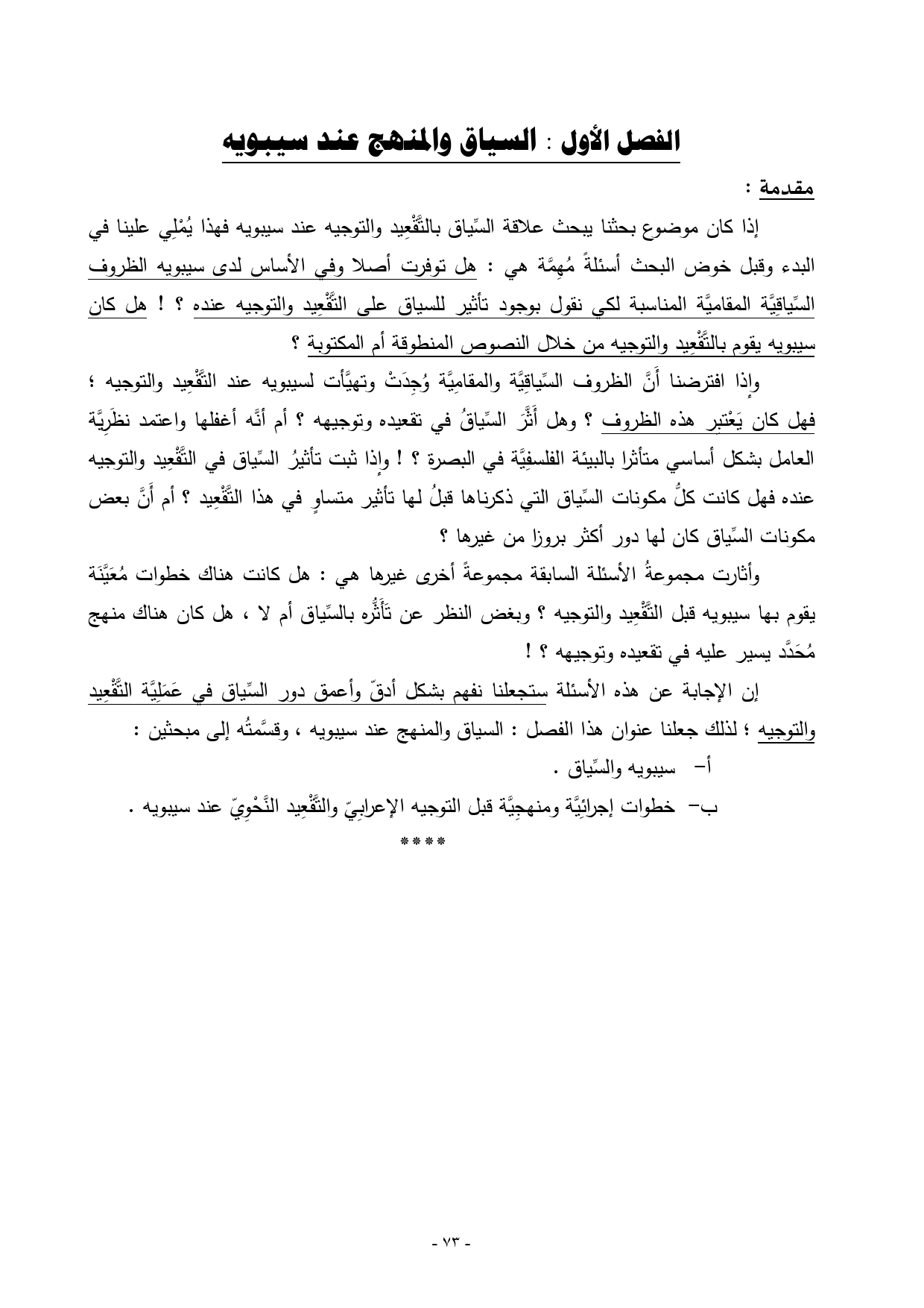 إن الإجابة عن هذه الأسئلة ستجعلنا نفهم بشكل أدقّ وأعمق دور السِّياق في عَمَلِيَّة التَّقْعِيد والتوجيه؛ لذلك جعلنا عنوان هذا الفصل: السياق والمنهج عند سيبويه، وقسَّمتُه إلى مبحثين: