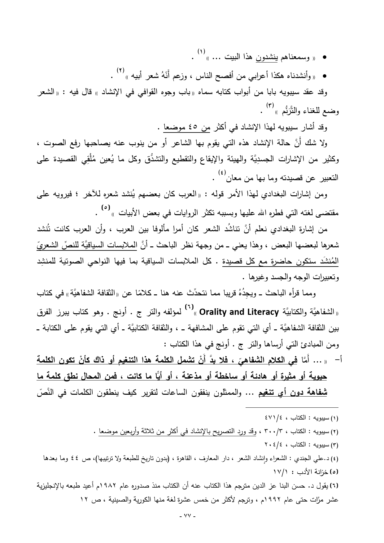 (¬2) سيبويه: الكتاب، 3/ 300، وقد ورد التصريح بالإنشاد في أكثر من ثلاثة وأربعين موضعا.