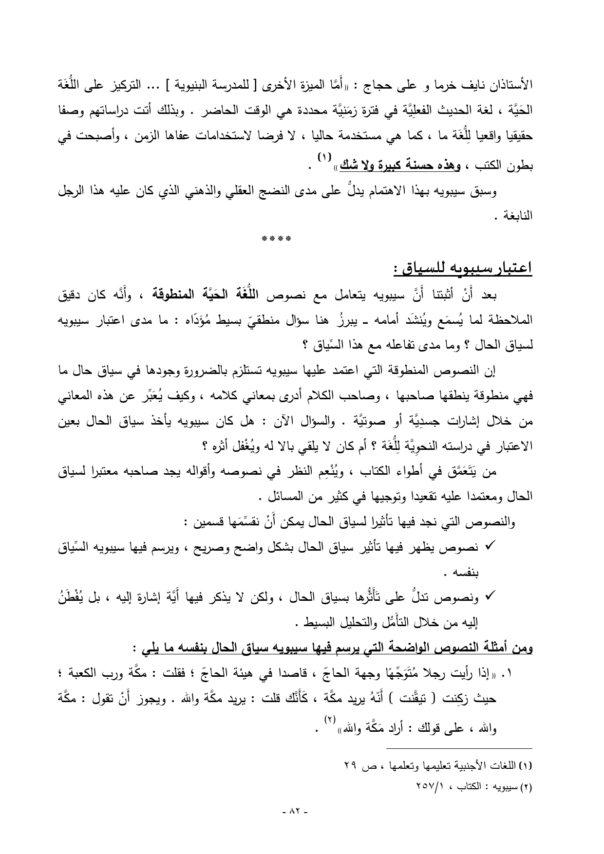 من يَتَعَمَّق في أطواء الكتاب، ويُنْعِم النظر في نصوصه وأقواله يجد صاحبه معتبرا لسياق الحال ومعتمدا عليه تقعيدا وتوجيها في كثير من المسائل.