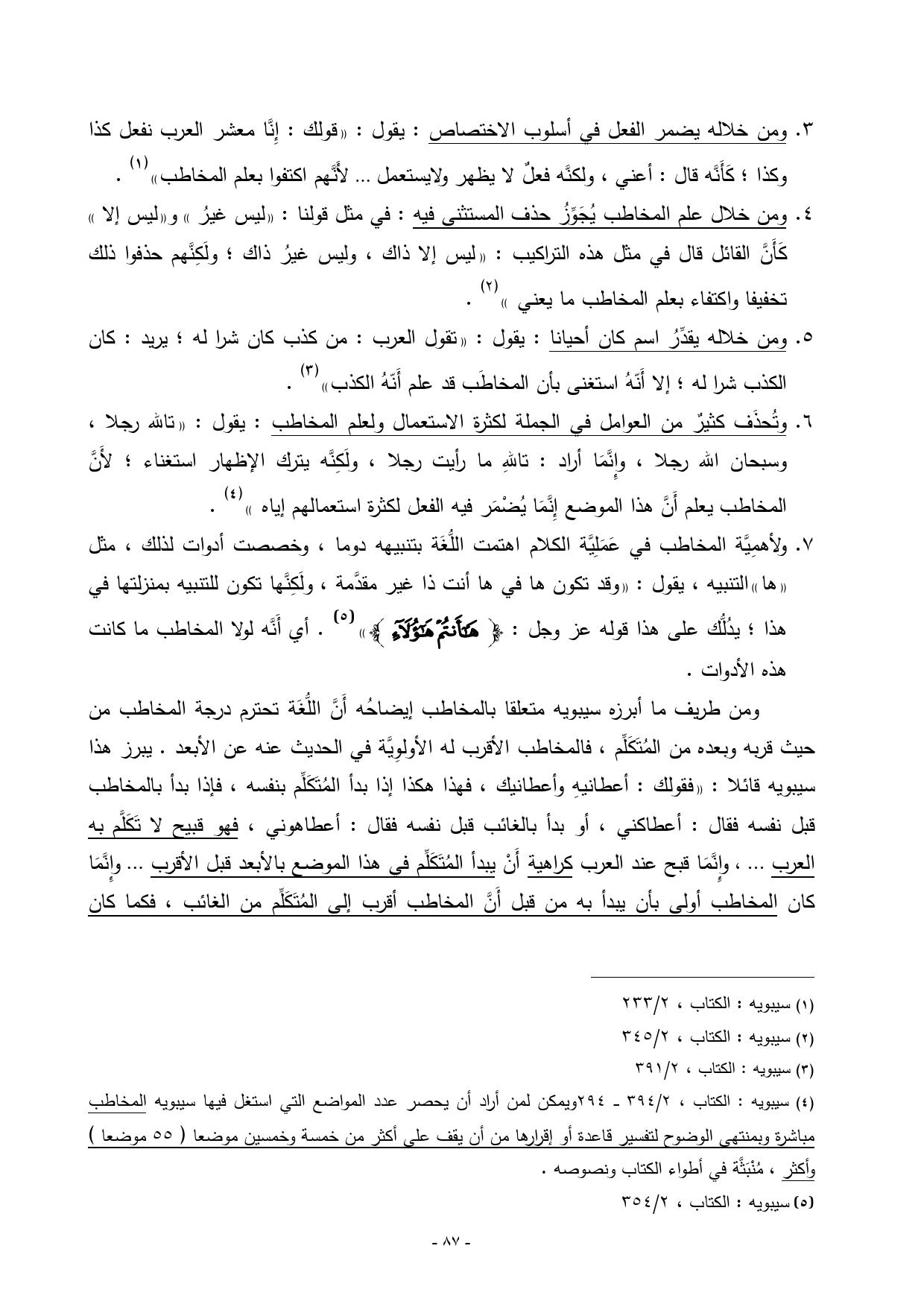 (¬4) سيبويه: الكتاب، 2/ 394 ــــ 294 ويمكن لمن أراد أن يحصر عدد المواضع التي استغل فيها سيبويه المخاطب مباشرة وبمنتهى الوضوح لتفسير قاعدة أو إقرارها من أن يقف على أكثر من خمسة وخمسين موضعا) 55 موضعا (وأكثر، مُنْبَثَّة في أطواء الكتاب ونصوصه.
