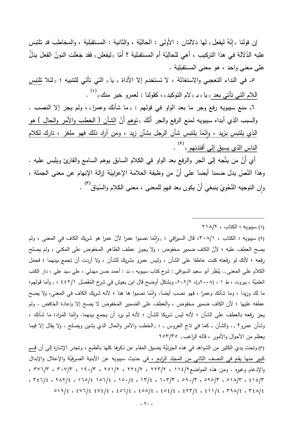 (¬3) وتحت يدي الكثير من الشواهد في هذه الجزئيَّة يضيق المقام عن ذكرها كلها بالطبع، وتجدر الإشارة إلى أن قسم كبير منها يقع في النصف الثاني من المجلد الرابع، في حديث سيبويه عن الأبنية الصرفِيَّة والإعلال والإبدال والإدغام وغيره. ومن هذه المواضع 2/ 114، 2/ 223، 2/ 224، 2/ 251، 3/ 190، 3/ 307، 3/ 376، 3/ 414، 3/ 518، 3/ 525، 3/ 590، 3/ 603، 4/ 13، 4/ 150، 4/ 156، 4/ 165، 4/ 282، 4/ 346، 4/ 348، 4/ 398، 4/ 411، 4/ 423، 4/ 454، 4/ 455، 4/ 456، 4/ 474، 4/ 476، 4/ 519