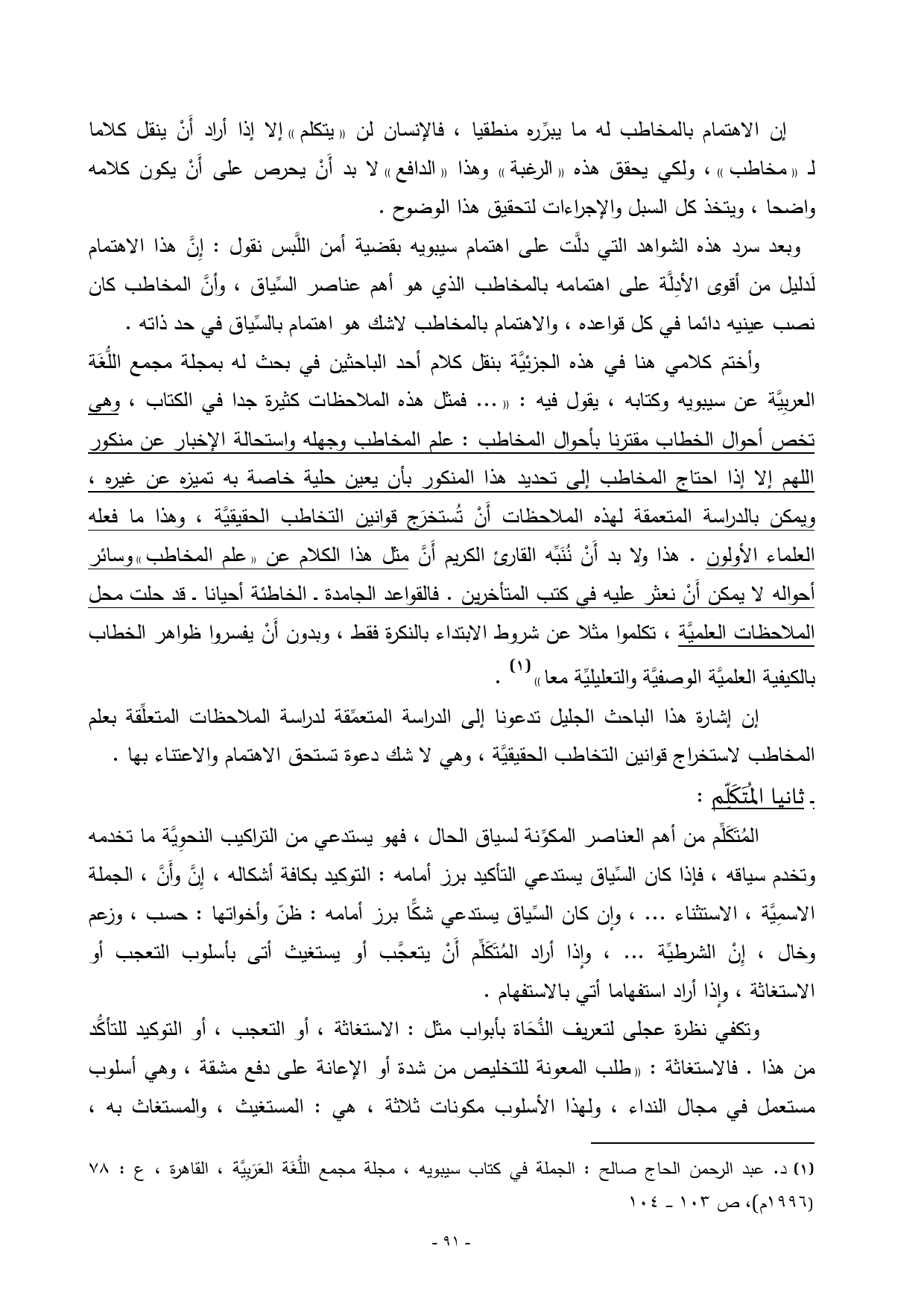 وأختم كلامي هنا في هذه الجزئيَّة بنقل كلام أحد الباحثين في بحث له بمجلة مجمع اللُّغَة العربِيَّة عن سيبويه وكتابه، يقول فيه: « ... فمثل هذه الملاحظات كثيرة جدا في الكتاب، وهي تخص أحوال الخطاب مقترنا بأحوال المخاطب: علم المخاطب وجهله واستحالة الإخبار عن منكور اللهم إلا إذا احتاج المخاطب إلى تحديد هذا المنكور بأن يعين حلية خاصة به تميزه عن غيره، ويمكن بالدراسة المتعمقة لهذه الملاحظات أَنْ تُستخرَج قوانين التخاطب الحقيقيَّة، وهذا ما فعله العلماء الأولون. هذا ولا بد أَنْ نُنَبِّه القارئ الكريم أَنَّ مثل هذا الكلام عن ((علم المخاطب)) وسائر أحواله لا يمكن أَنْ نعثر عليه في كتب المتأخرين. فالقواعد الجامدة ــ الخاطئة أحيانا ــ قد حلت محل الملاحظات العلميَّة، تكلموا مثلا عن شروط الابتداء بالنكرة فقط، وبدون أَنْ يفسروا ظواهر الخطاب بالكيفية العلميَّة الوصفيَّة والتعليليِّة معا») (¬1).