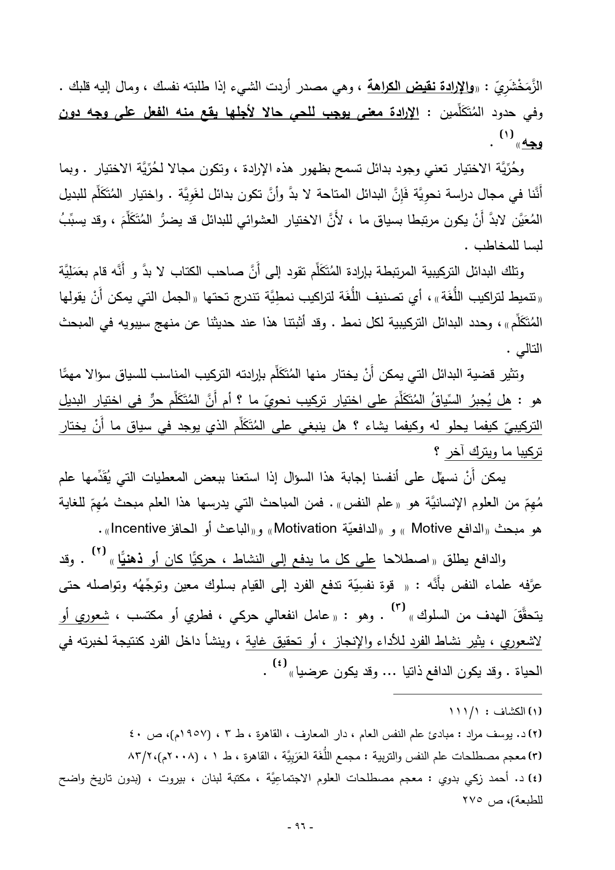 وحُرِّيَّة الاختيار تعني وجود بدائل تسمح بظهور هذه الإرادة، وتكون مجالا لحُرِّيَّة الاختيار. وبما أَنَّنا في مجال دراسة نحوِيَّة فَإِنَّ البدائل المتاحة لا بدَّ وأنَّ تكون بدائل لغَوِيَّة. واختيار المُتَكَلِّم للبديل المُعَيَّن لابدَّ أَنْ يكون مرتبطا بسياق ما، لأَنَّ الاختيار العشوائي للبدائل قد يضرُّ المُتَكَلِّمَ، وقد يسبِّبُ لبسا للمخاطب.