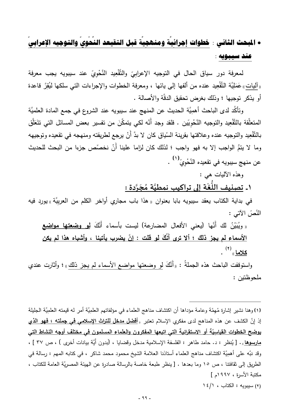 (¬1) وهنا نشير إشارة مُهِمَّة وعامة مؤداها أن اكتشاف مناهج العلماء في مؤلفاتهم العلمِيَّة أمر له قيمته العلمِيَّة الجليلة إذ إِنَّ الكشف عن هذه المناهج لدى مفكري الإسلام تعتبر ((أفضل مدخل للتراث الإسلامي في جملته؛ فهو الذي يوضح الخطوات القياسِيَّة أو الاستقرائية التي اتبعها المفكرون والعلماء المسلمون في مختلف أوجه النشاط التي مارسوها)). [يُنظر: د. حامد طاهر: الفلسفة الإسلامية مدخل وقضايا، ) بدون أَيَّة بيانات أخرى (، ص 37]، وقد نبَّه على أهمِيَّة اكتشاف مناهج العلماء أستاذنا العلامة الشيخ محمود محمد شاكر، في كتابه المهم: رسالة في الطريق إلى ثقافتنا، ص 15 وما بعدها. [ينظر طبعة خاصة بالرسالة صادرة عن الهيئة المصريَّة العامة للكتاب، مكتبة الأسرة، 1997 م]