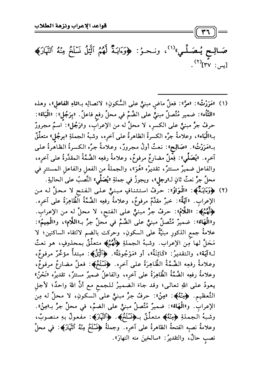(¬١) «مَرَرْتُ»: «مرَّ»: فعلٌ ماضٍ مبنيٌّ على السُّكونِ؛ لاتصالِه بـ «تاءِ الفاعلِ»، وهذه «التَّاُء»: ضمير مُتَّصلٌ مبنيٌّ على الضَّمِّ في محلِّ رفعٍ فاعلٌ. «بِرَجُلٍ»: «الْبَاءُ»: حرفُ جرٍّ مبنيٌّ على الكسرِ، لا محلَّ له من الإعرابِ، و «رَجُل»: اسمٌ مجرورٌ بـ «الْبَاء»، وعلامةُ جرِّه الكسرةُ الظاهرةُ على آخرِه، وشبهُ الجملةِ «برجُلٍ» متعلِّقٌ بـ «مَرَرْتُ». «صَالِحٍ»: نعتٌ أولُ مجرورٌ، وعلامةُ جرِّه الكسرةُ الظاهرةُ على آخرِه. «يُصَلِّي»: فِعلٌ مضارعٌ مرفوعٌ، وعلامةُ رفعِه الضَّمَّةُ المقدَّرةُ على آخرِه، والفاعل ضميرٌ مستترٌ، تقديرُه «هُوَ»، والجملةُ من الفعلِ والفاعلِ المستترِ في محلِّ جرٍّ نعتٌ ثانٍ لـ «رجلٍ»، ويجوزُ في جملةِ «يُصَلِّي» النَّصبُ على الحاليةِ.