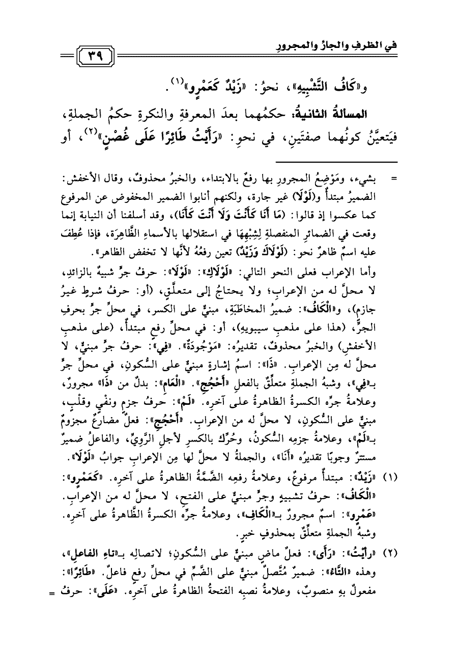 (¬١) «زَيْدٌ»: مبتدأٌ مرفوعٌ، وعلامةُ رفعِه الضَّمَّةُ الظاهرةُ على آخرِه. «كَعَمْرٍو»: «الْكَافُ»: حرفُ تشبيهٍ وجرٍّ مبنيٌّ على الفتحِ، لا محلَّ له من الإعرابِ. «عَمْرٍو»: اسمٌ مجرورٌ بـ «الْكَافِ»، وعلامةُ جرِّه الكسرةُ الظَّاهرةُ على آخرِه. وشبهُ الجملةِ متعلِّقٌ بمحذوفٍ خبرٍ.